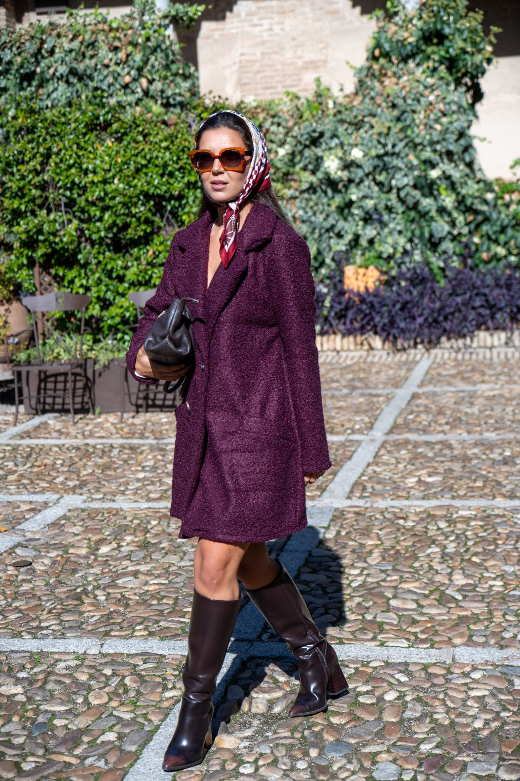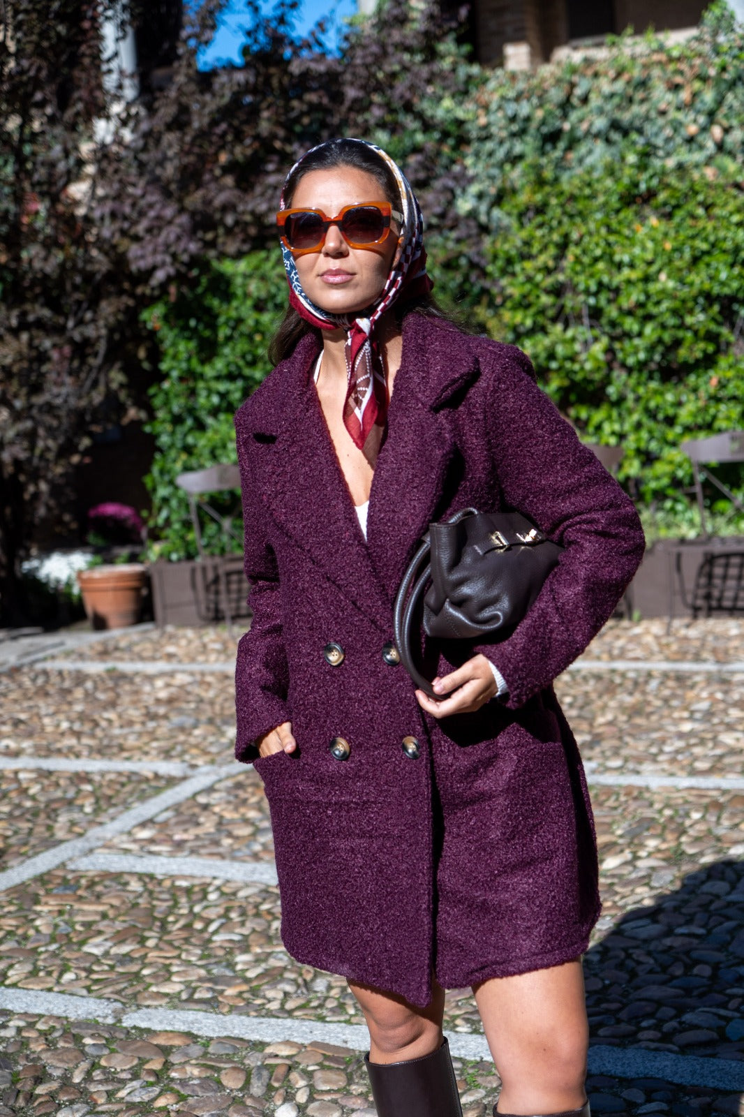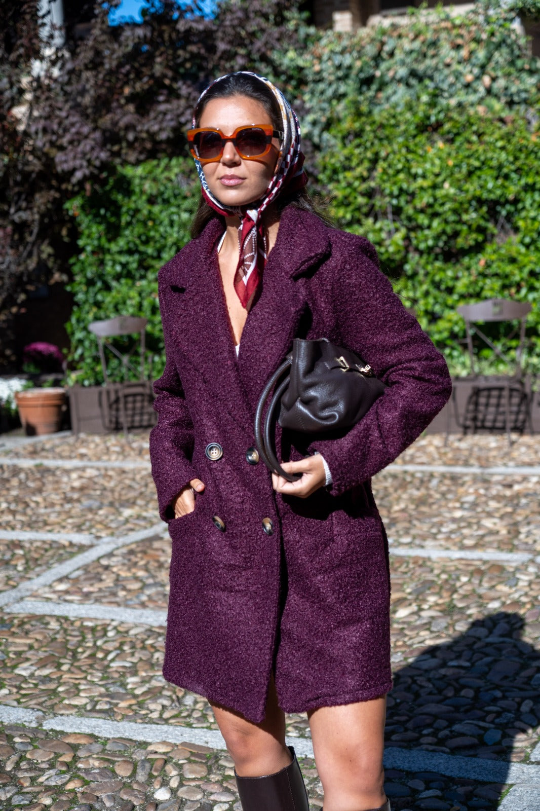 Coat with lapel collar, side pockets, oversized, double-breasted button closure. In aubergine color.