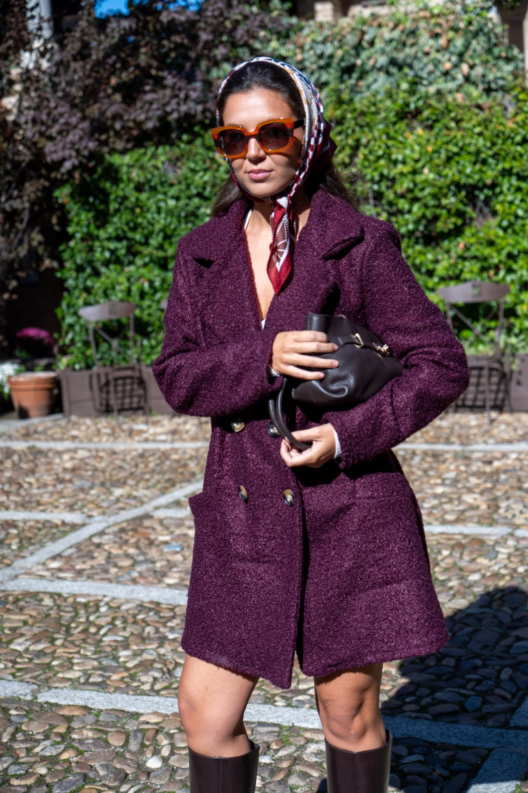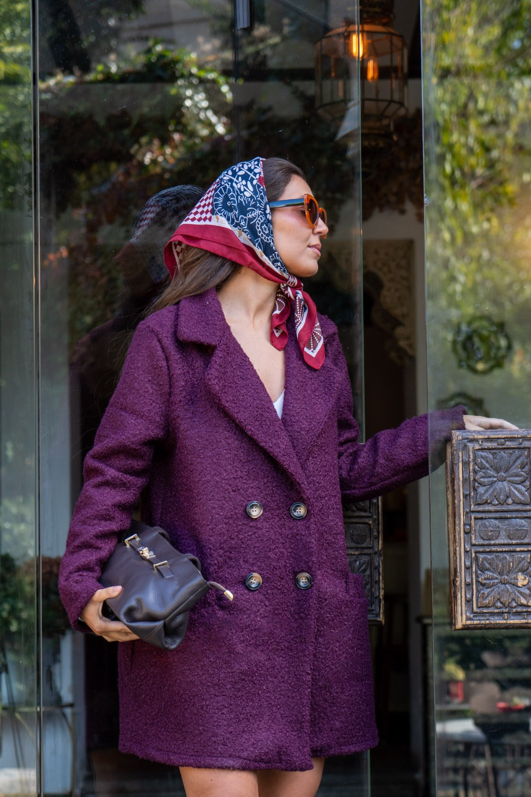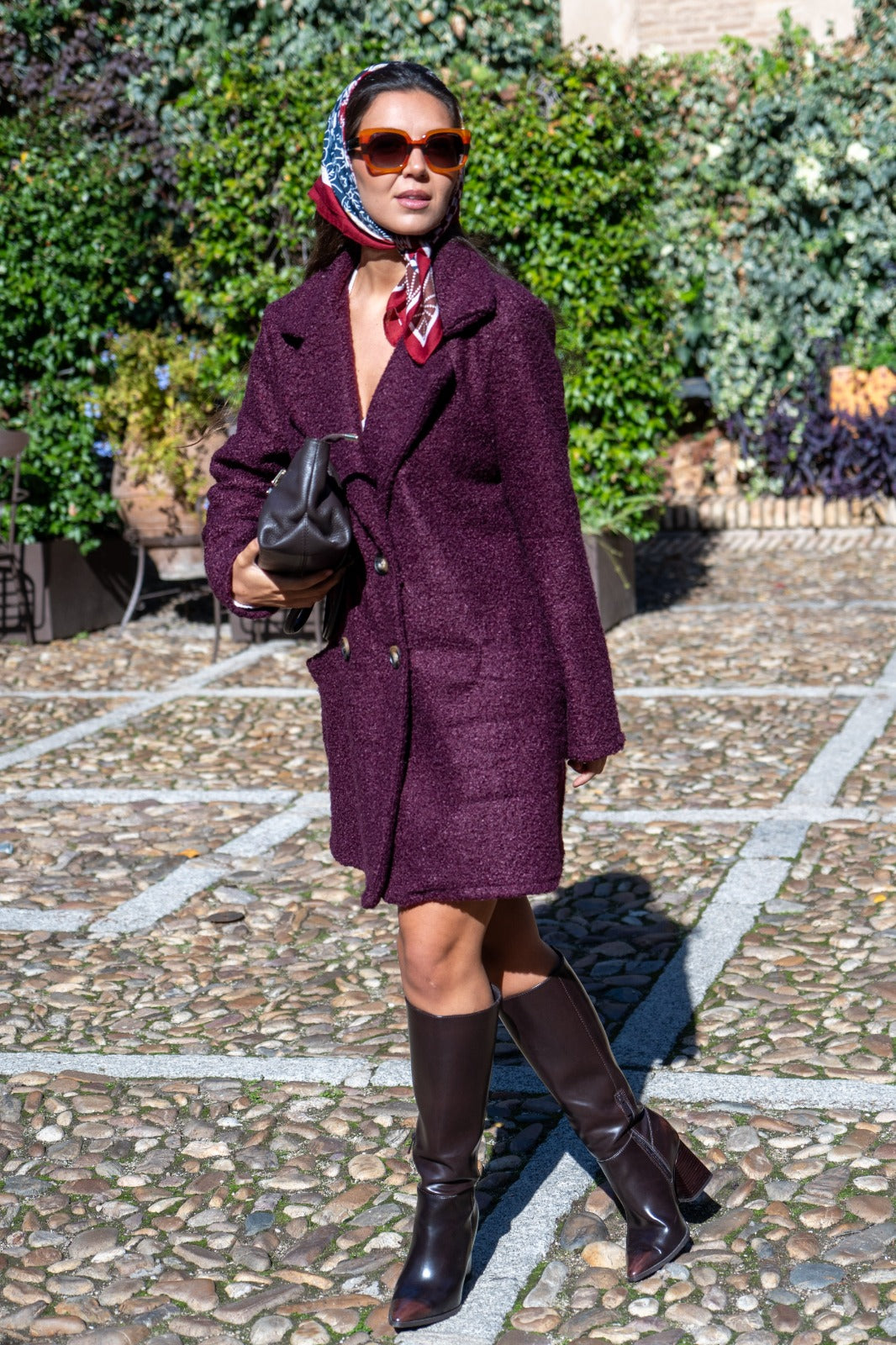 Coat with lapel collar, side pockets, oversized, double-breasted button closure. In aubergine color.