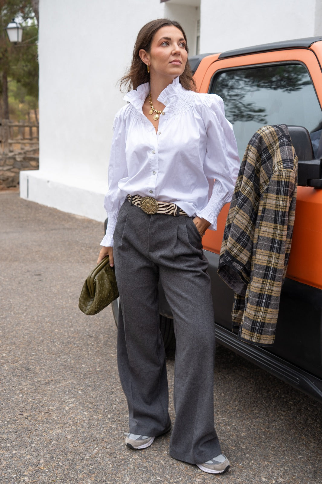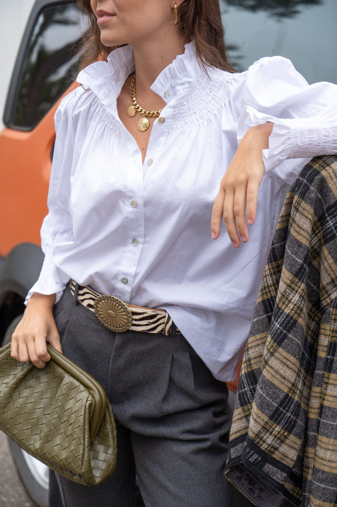 Blusa manga larga con puño fruncido, cuello subido fruncido, abotonada en color blanco.