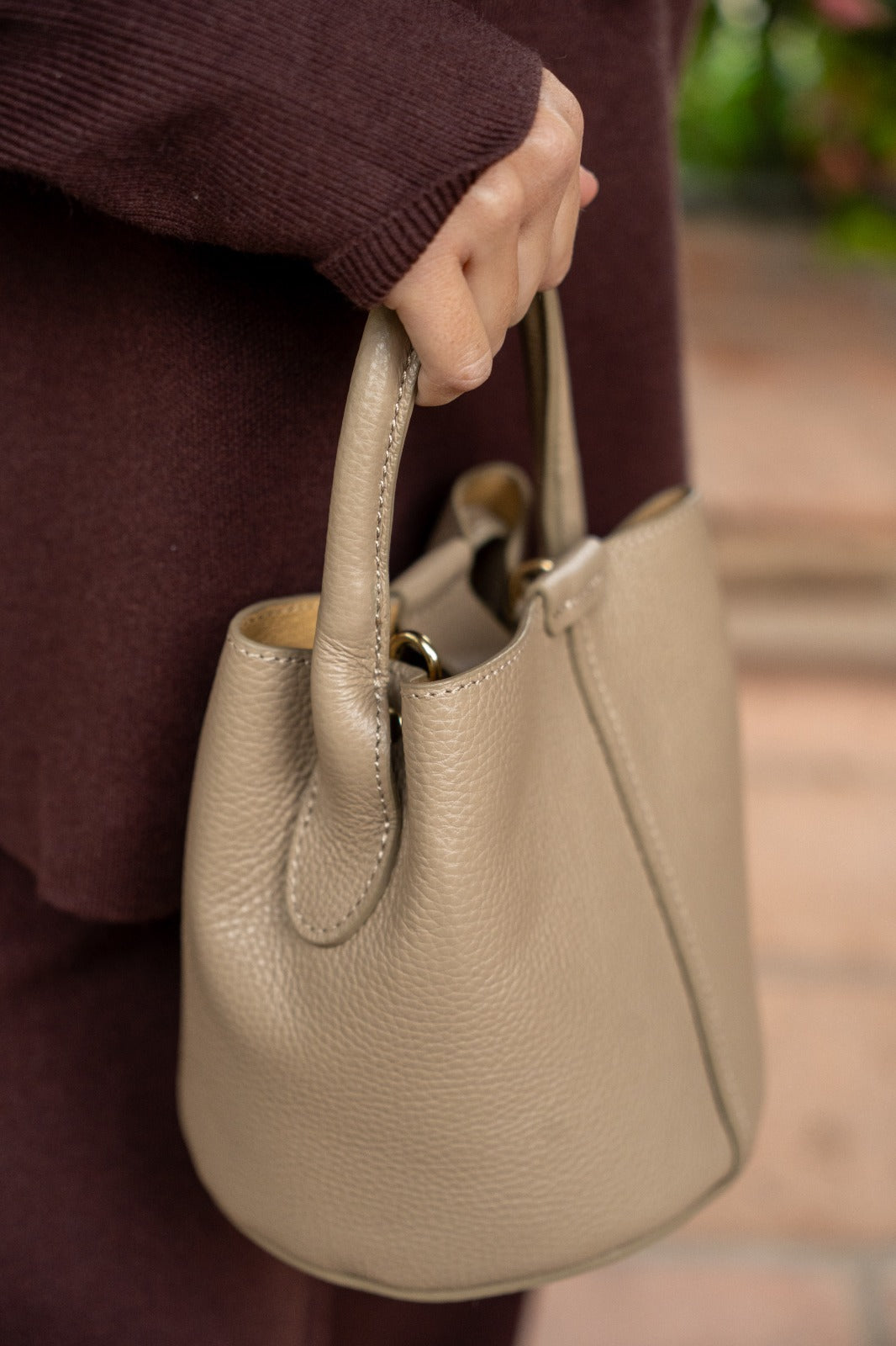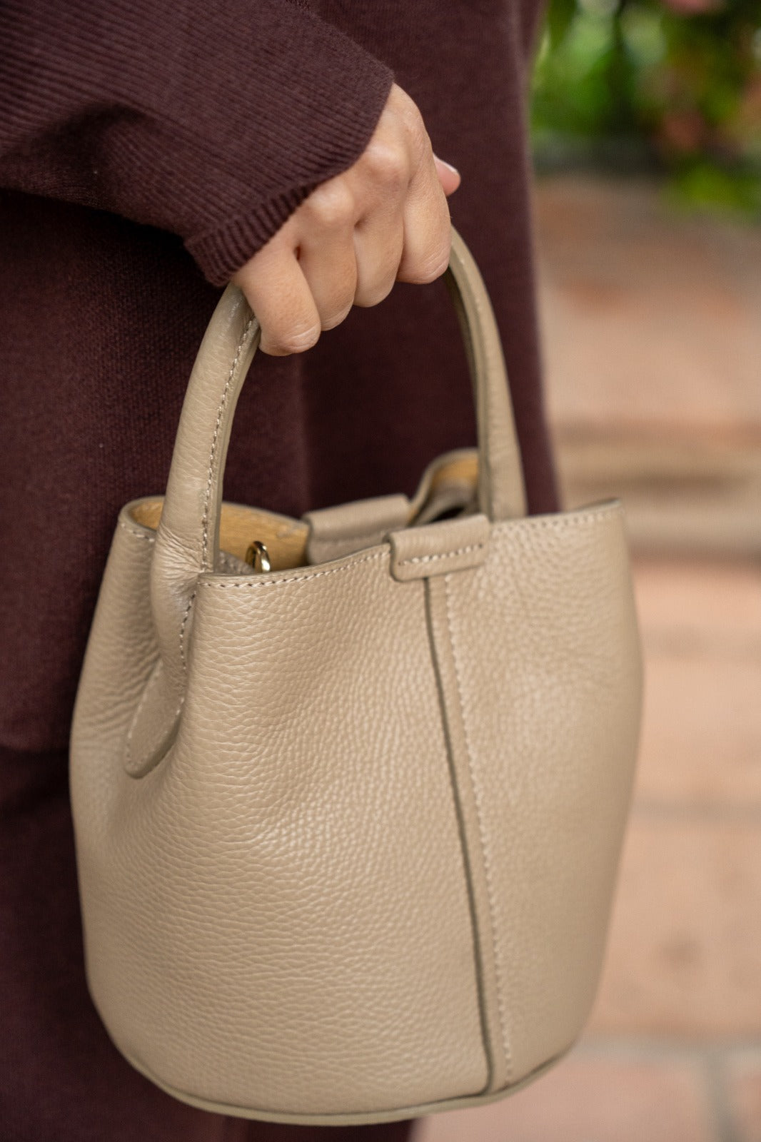 Faux leather handbag, short handle, round base, snap closure. Beige color.