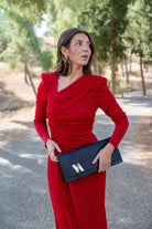 Maxi handbag in embossed textured leather, can be worn as a clutch or with a chain, and has a snap closure. In black.
