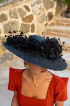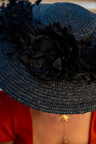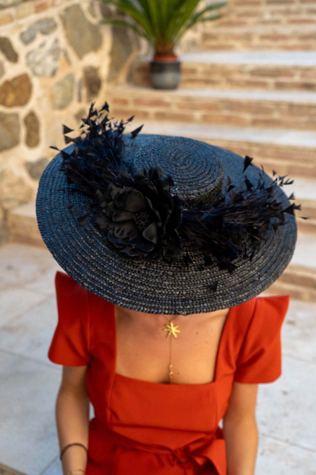 Straw-colored hat with floral details, hand-dyed black. Headband for support.