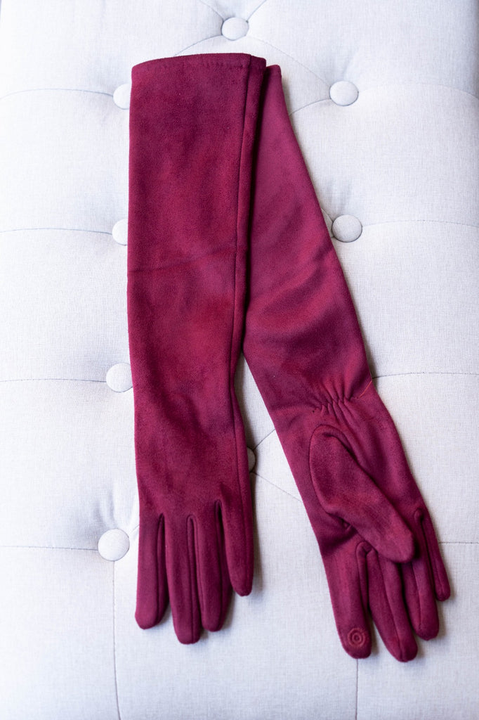 Guantes largos de antelina, elásticos se adaptan perfectamente y quedan ajustados. Color burdeos.