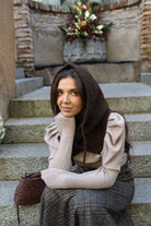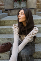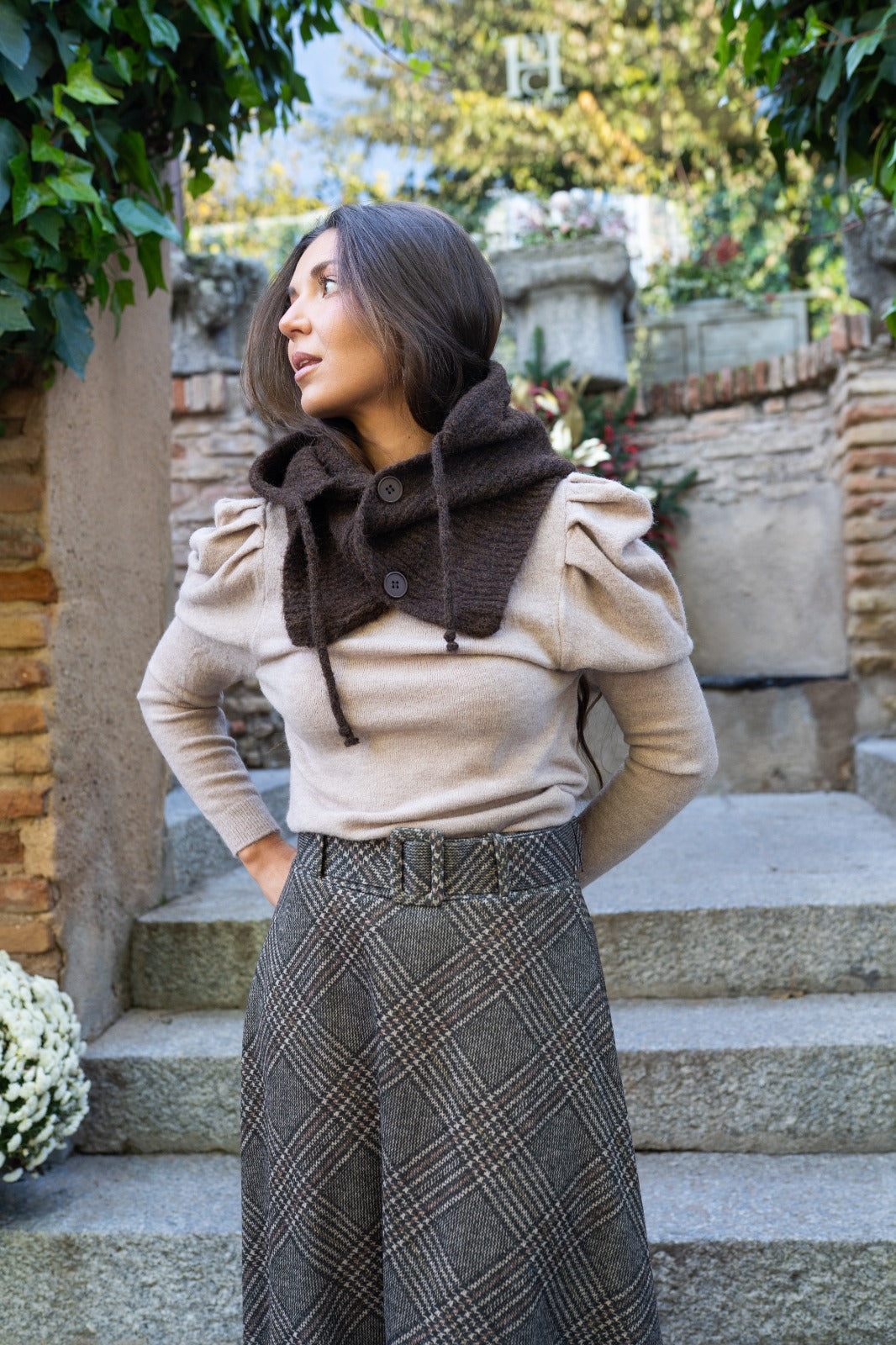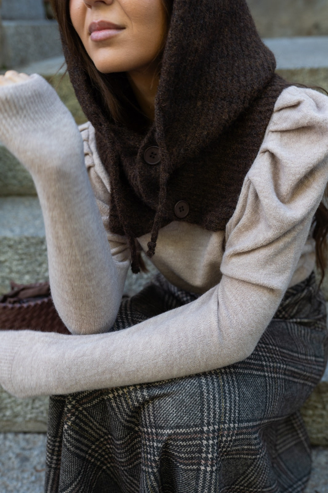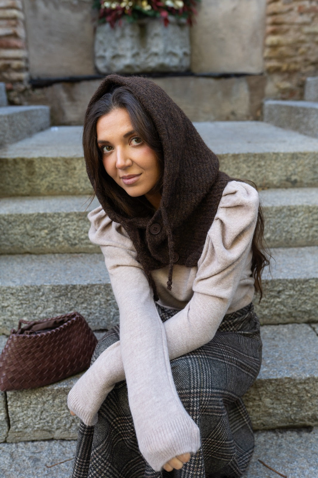 Combination of hat and scarf, with buttons at the neck, in brown.