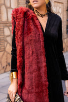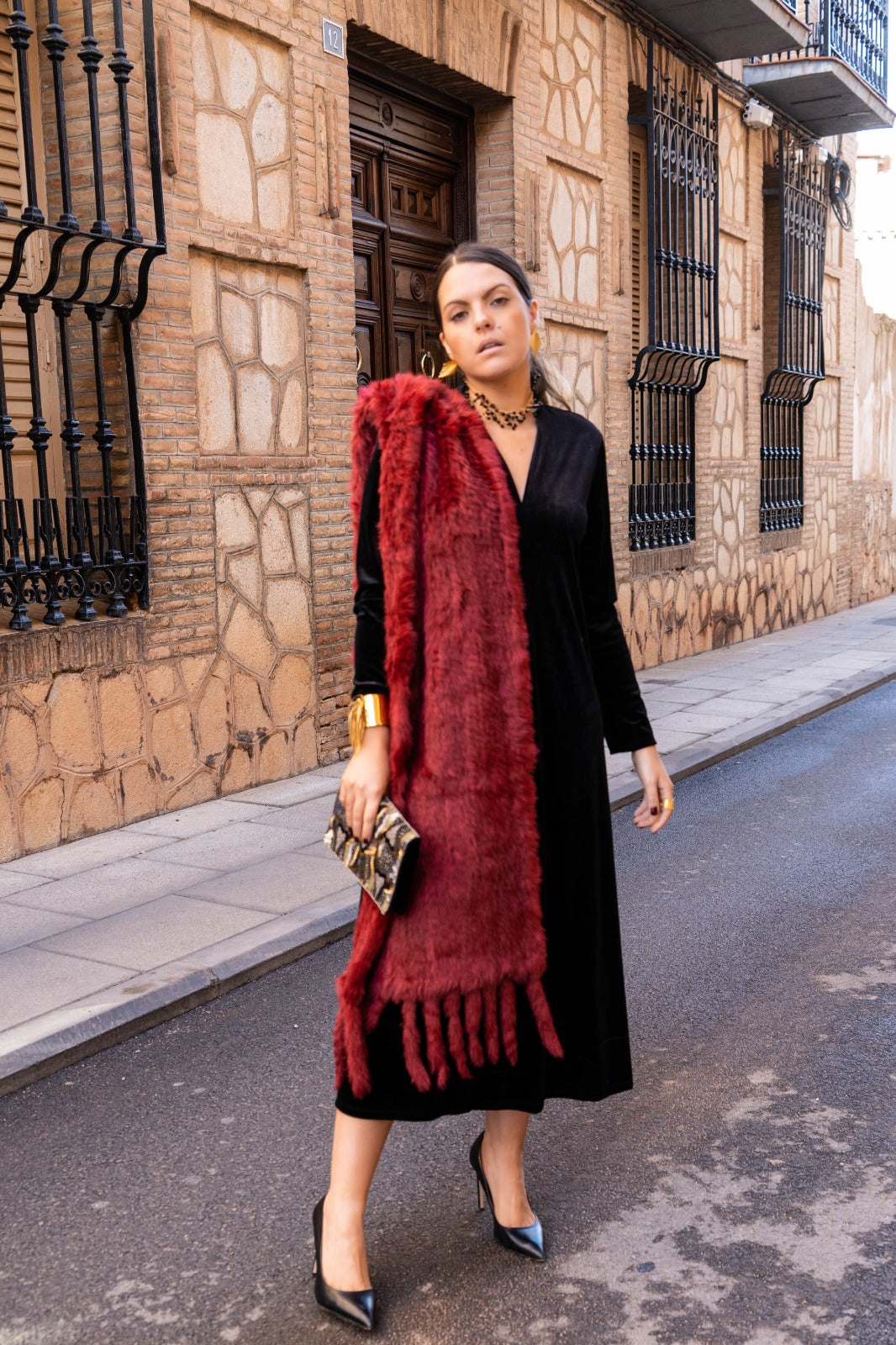 Fur stole, with fringes at the ends, multicoloured in burgundy tones. Measurements 165x40cm