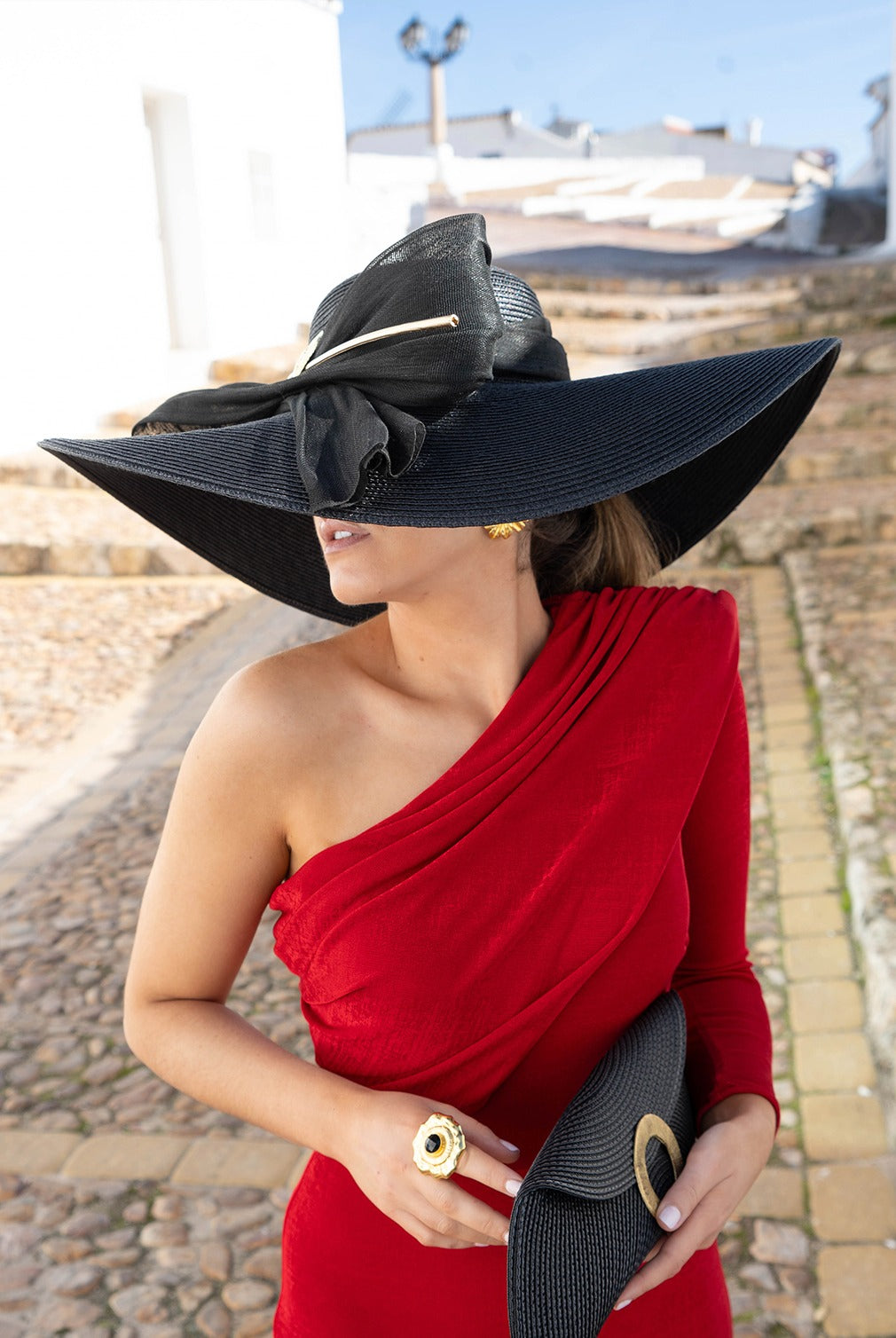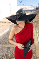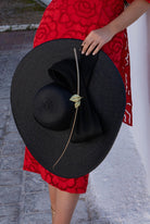 Black polypropylene pamela, handmade with a silk sinamay bow finished with a rachis and gold brass leaves, with a headband to hold it in place.