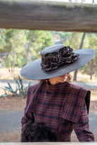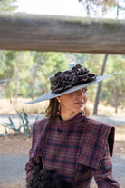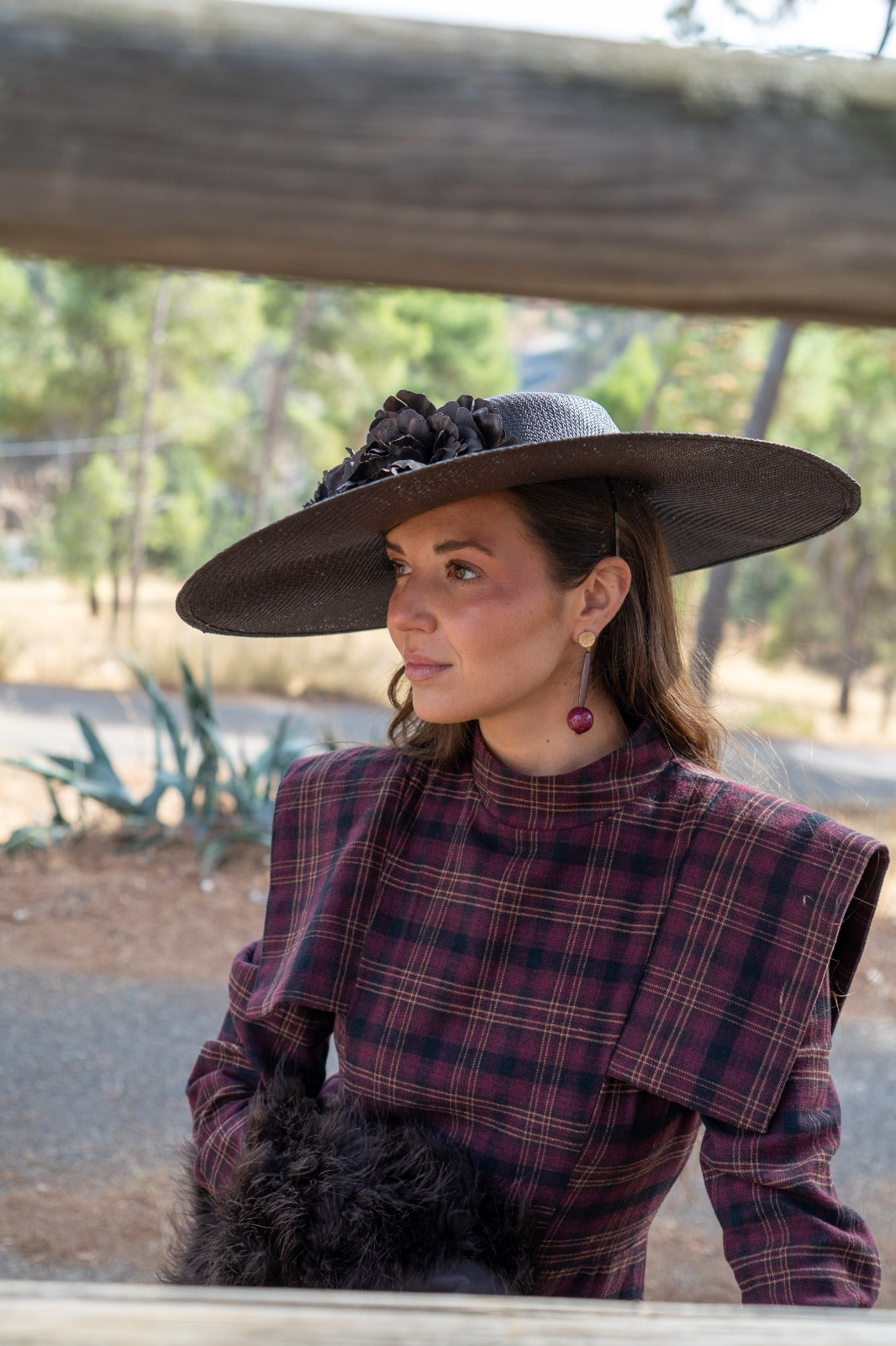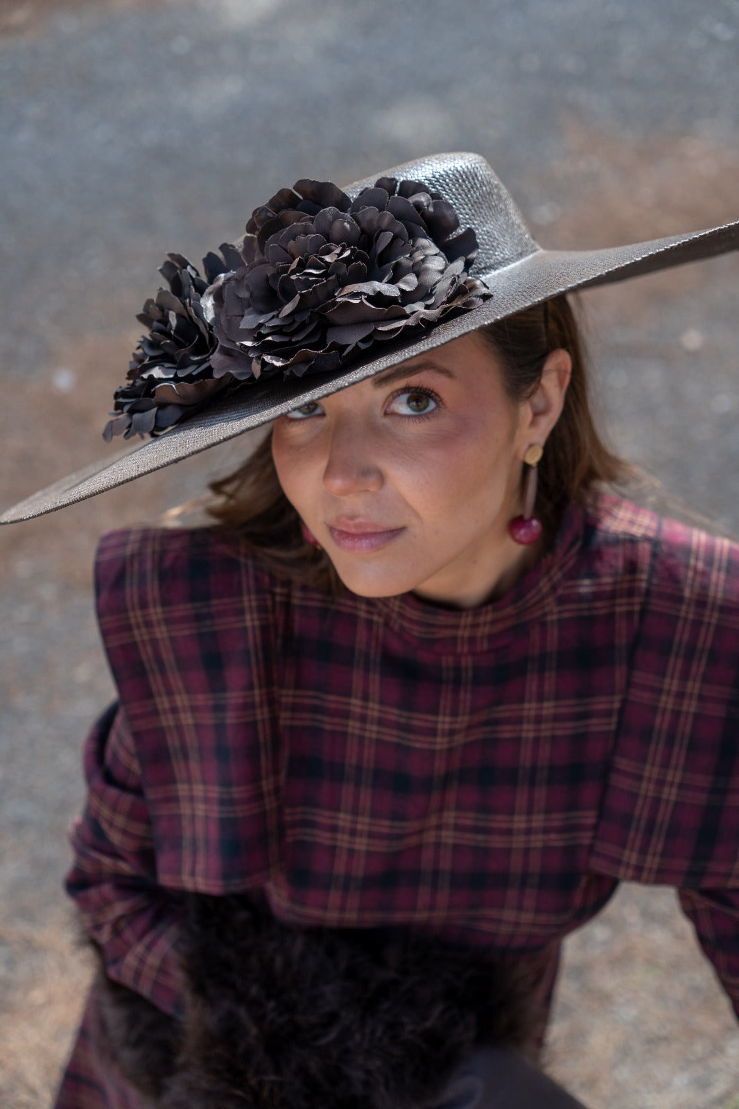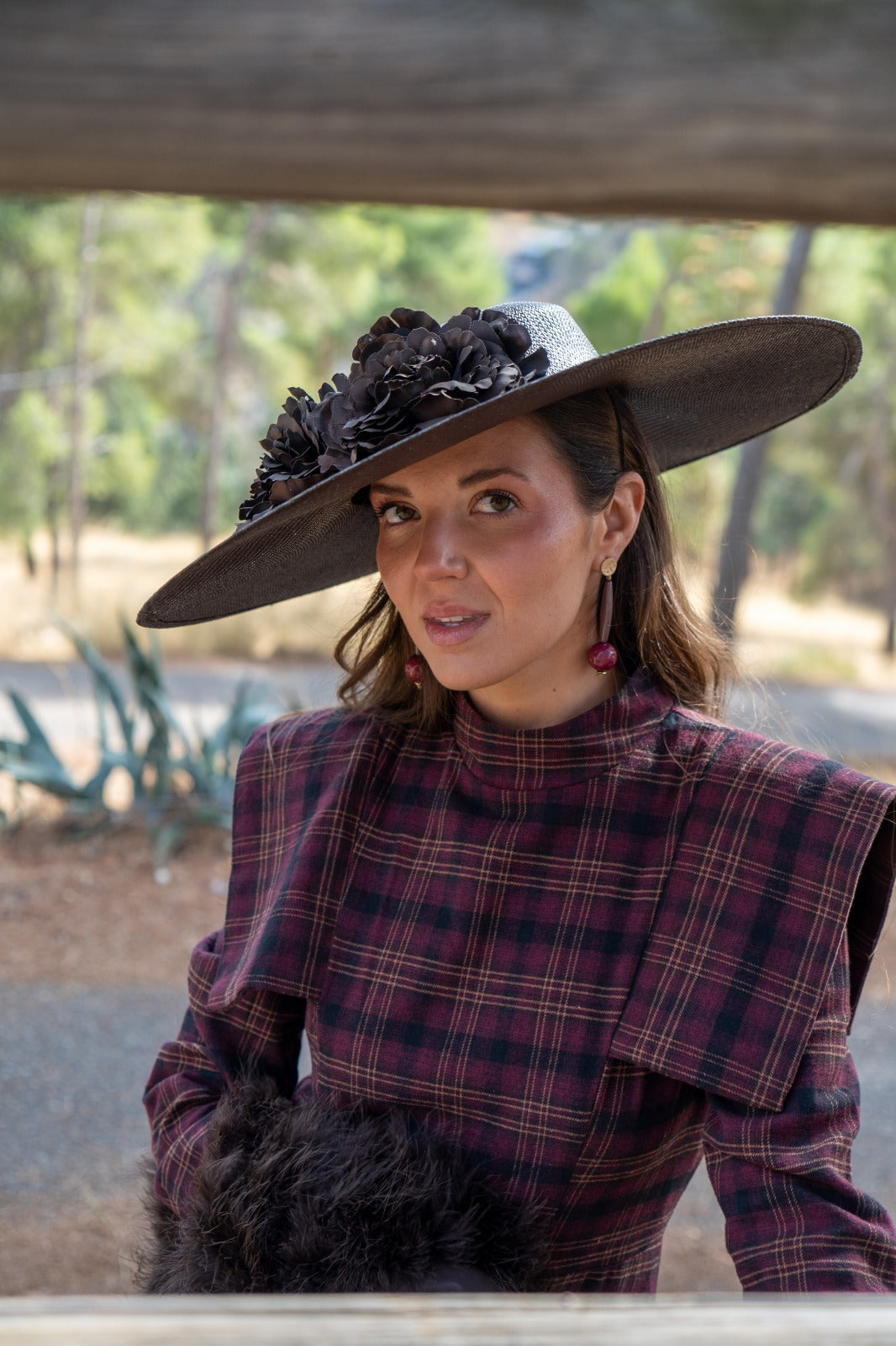 Pamela hat made of natural fiber, hand-dyed using traditional methods, with floral details. Fastens with a headband.