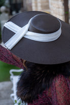 Hand-dyed, natural fiber hat with a beige bow detail. Fastens with a headband.