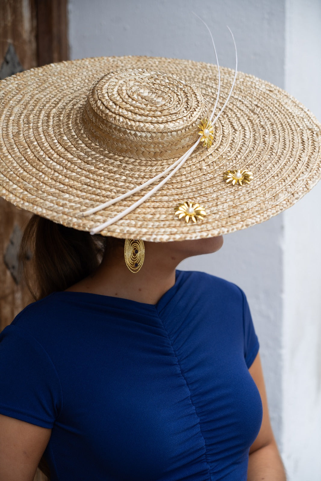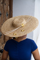 Pamela straw hat with feather quills and metallic details, in a hand-dyed gold color.