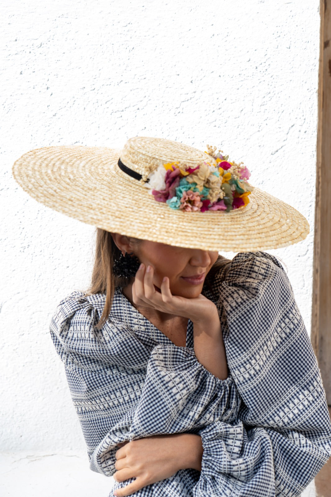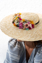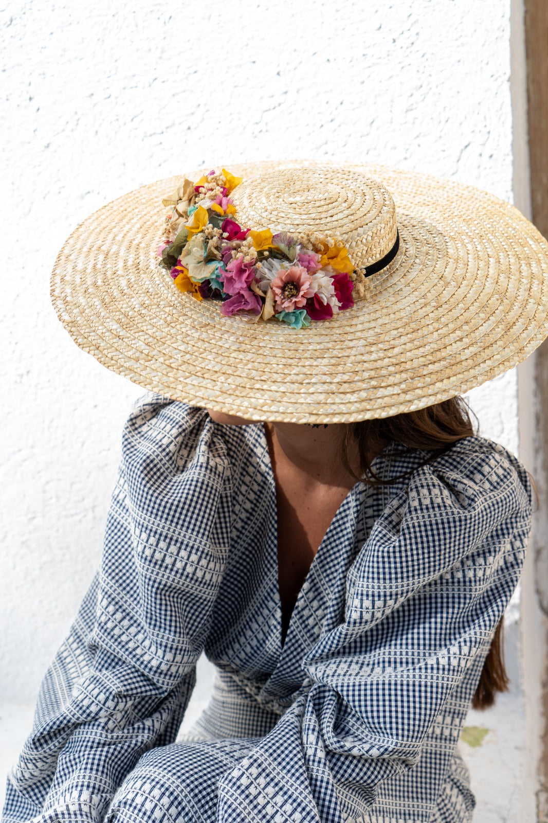 Natural straw hat measuring approx. 55 cm. Handcrafted with preserved hydrangeas in different shades. The colour and shape of the flowers may vary due to their handmade nature.