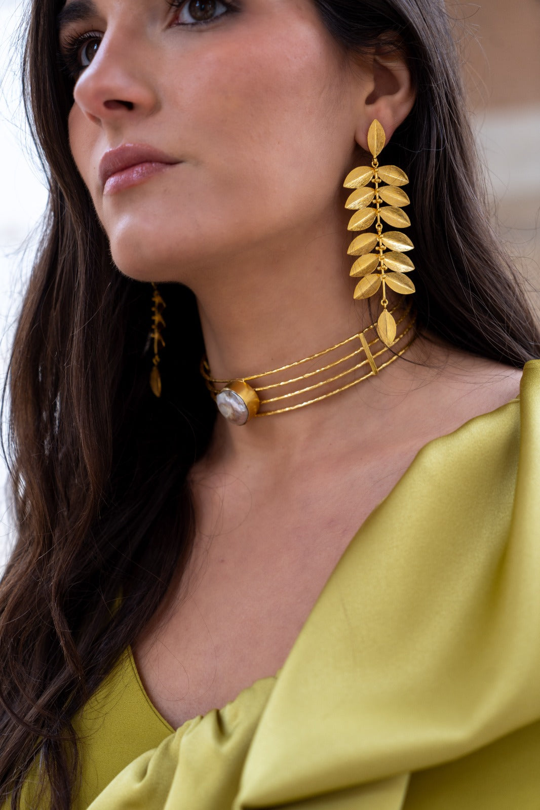 Long earrings made up of multiple handcrafted leaves, nut closure, gold plated.
