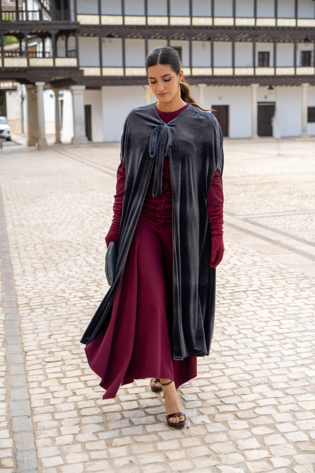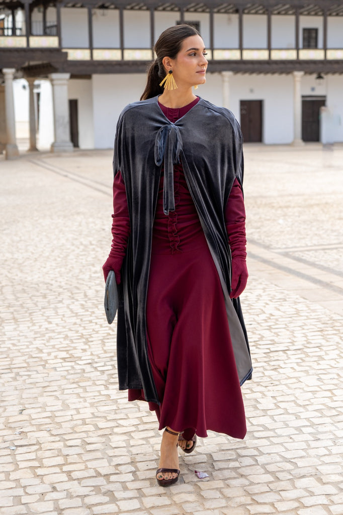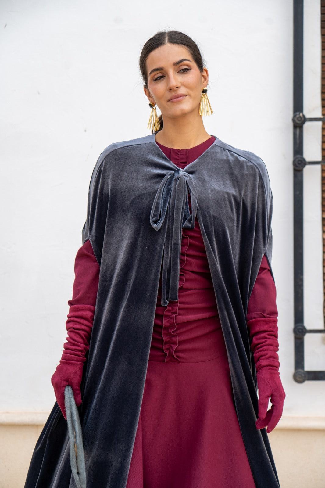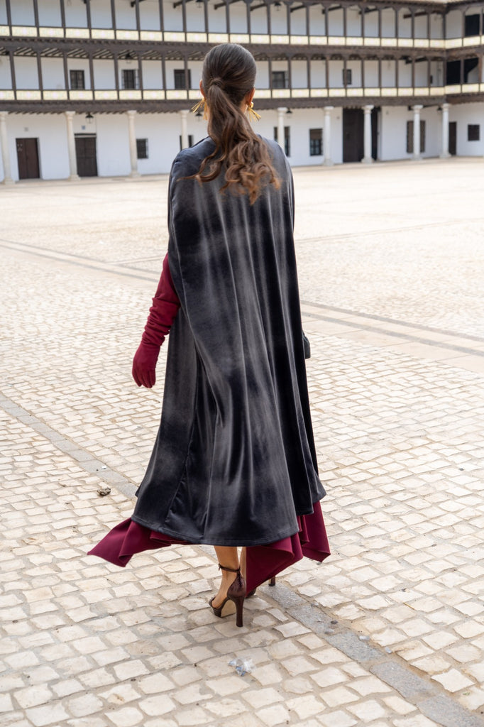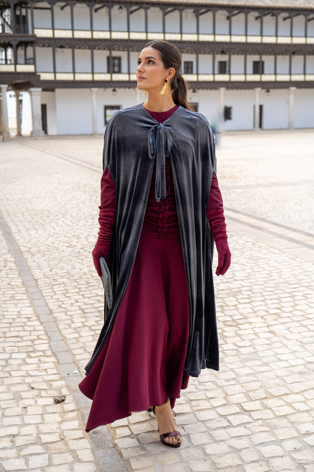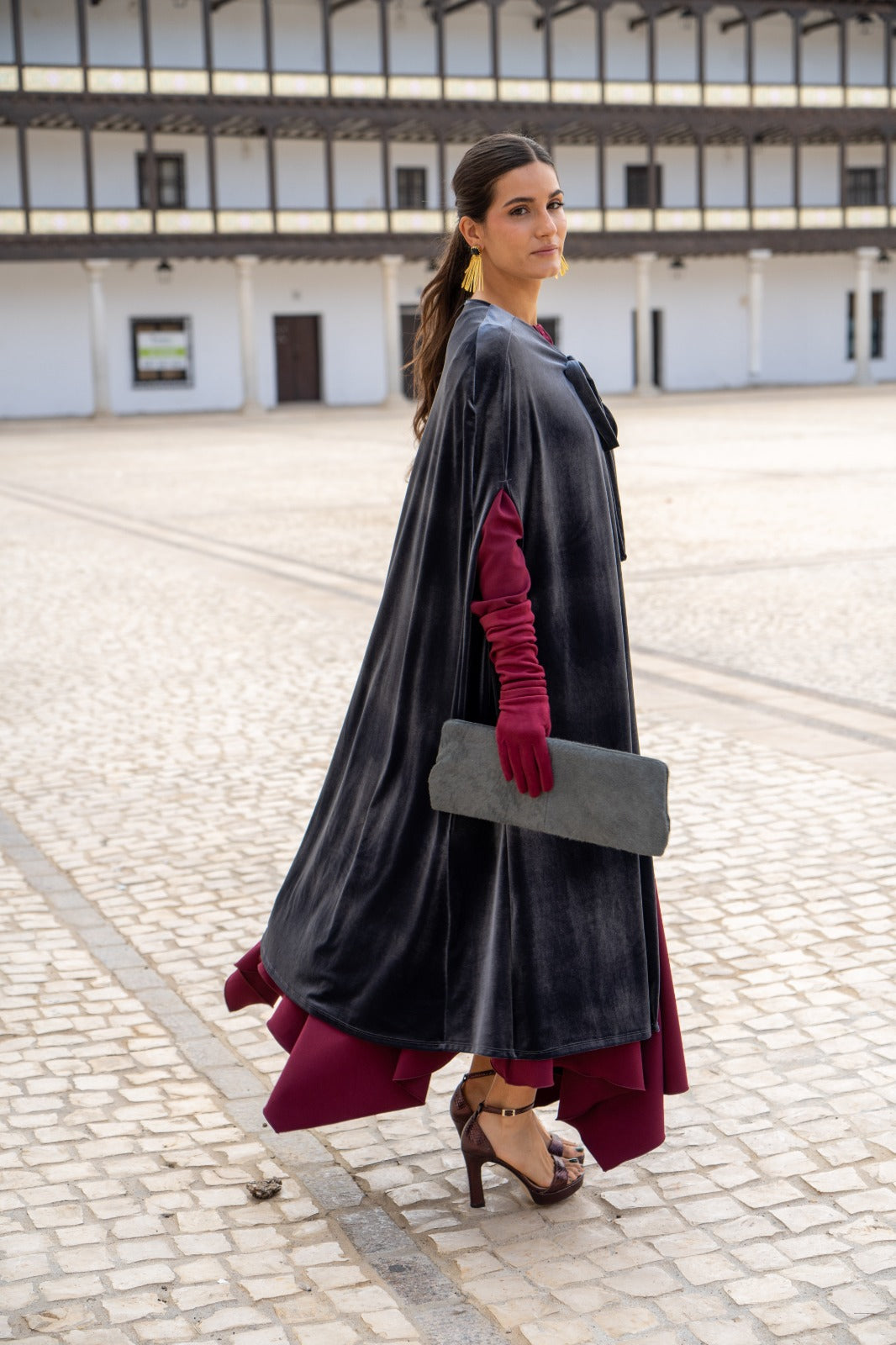 Capa en terciopelo, abertura para meter las manos, 120cm aprox de largo, con lazo para anudar al cuello. En color gris.