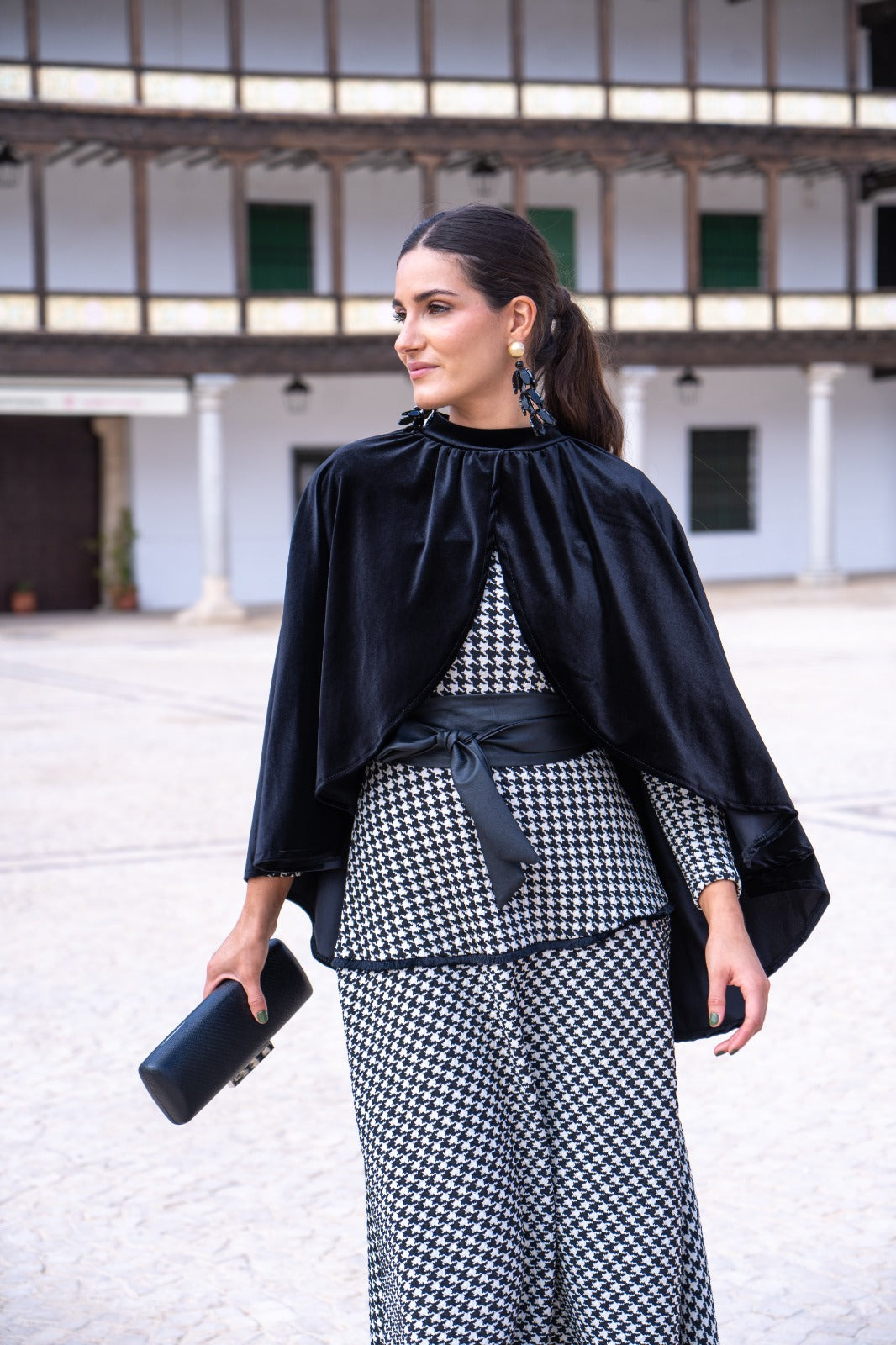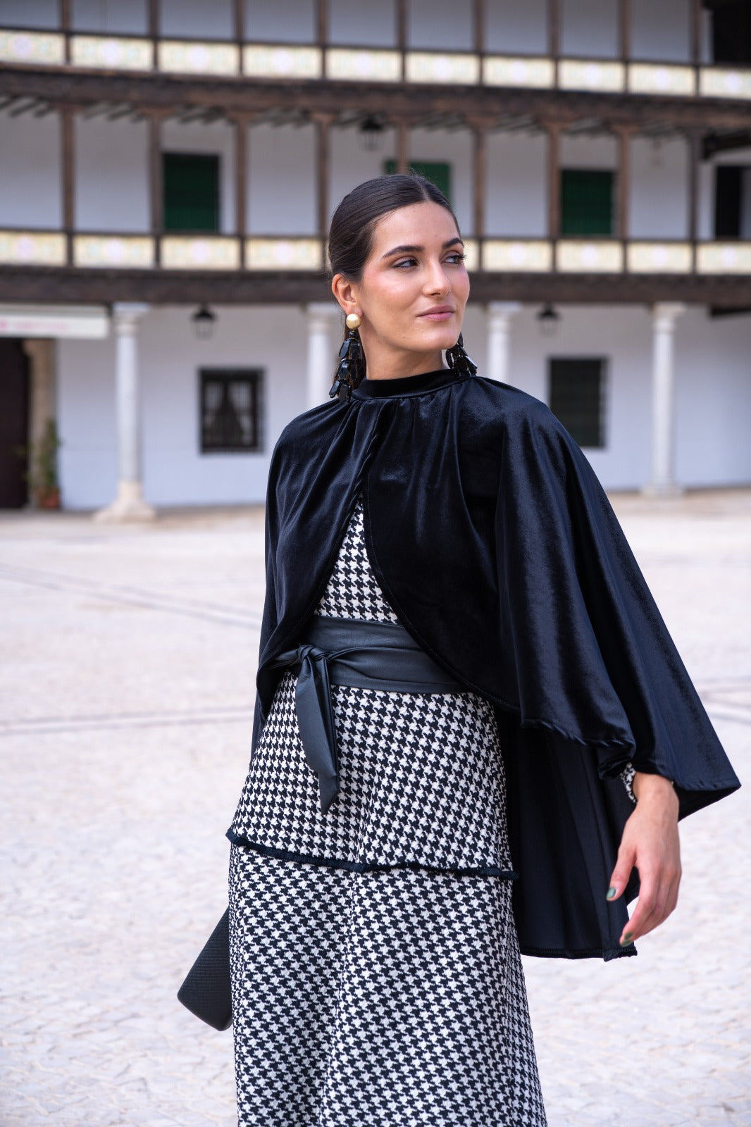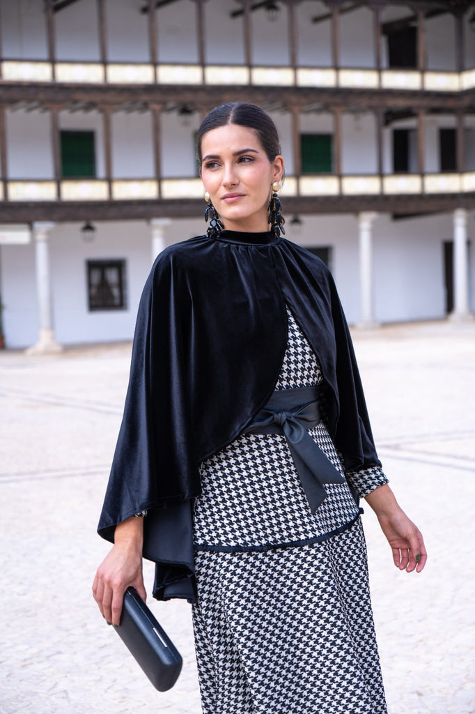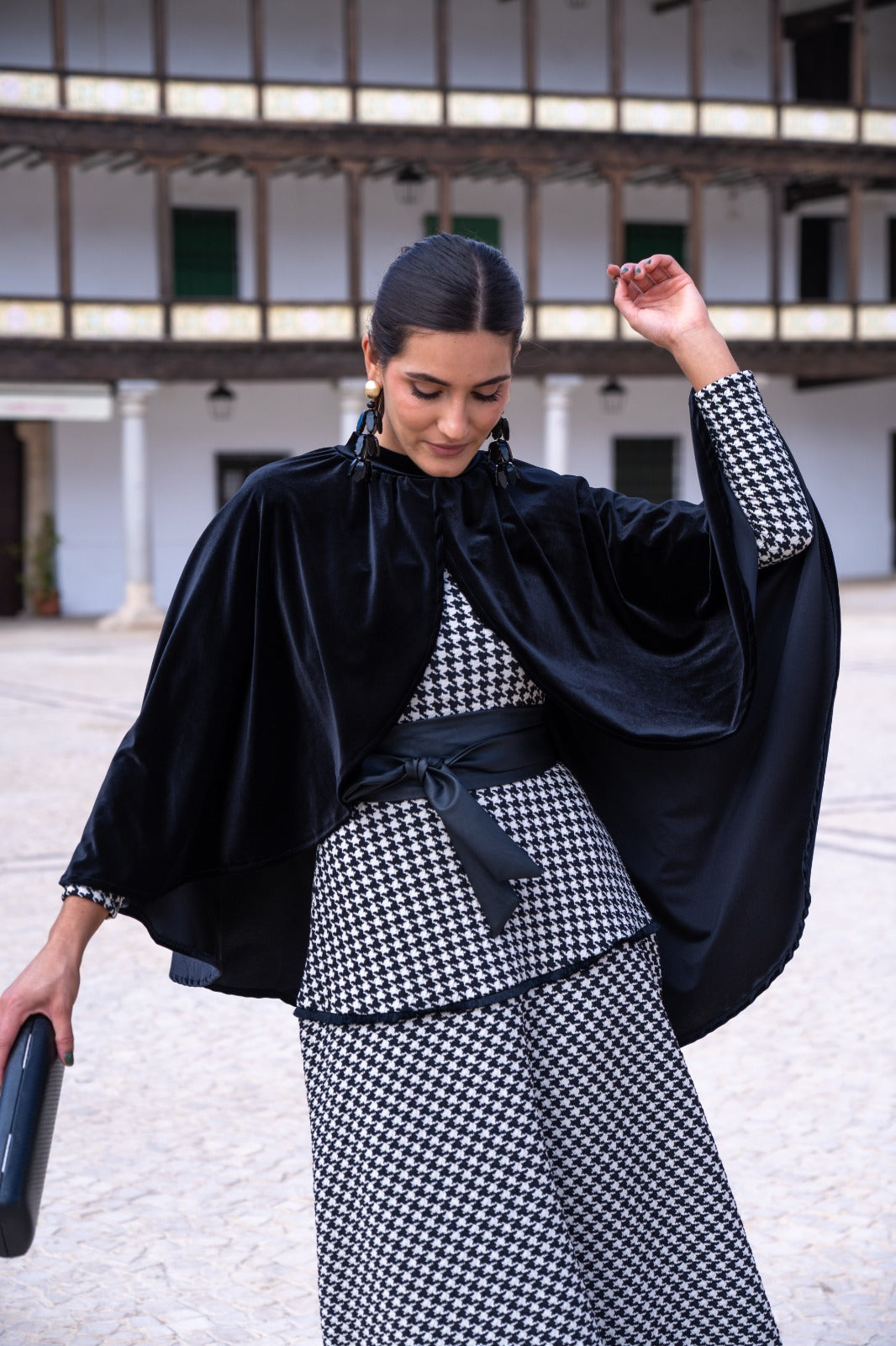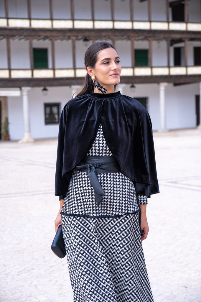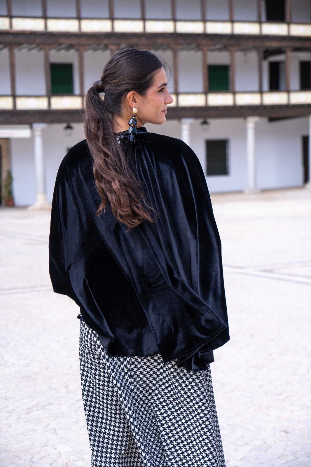Capa corta, en terciopelo, cuello perkins, abierta en la parte delantera, cerrada por la parte trasera, abrochada con dos botones. En color negro.