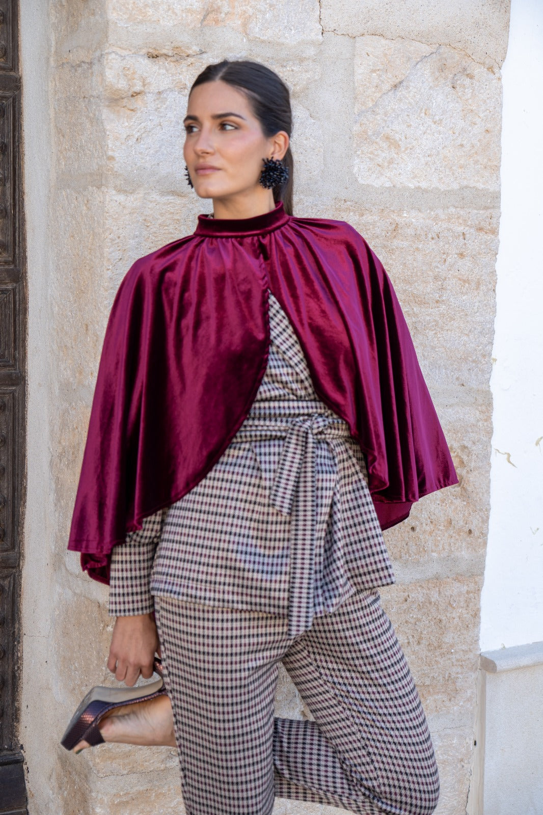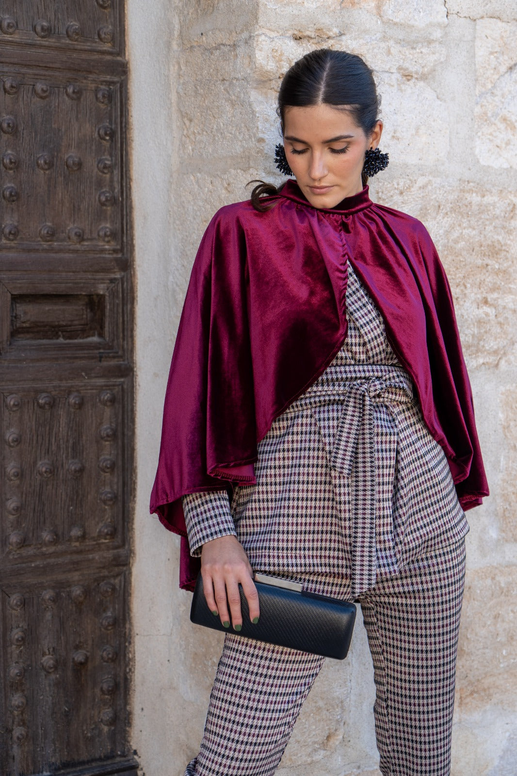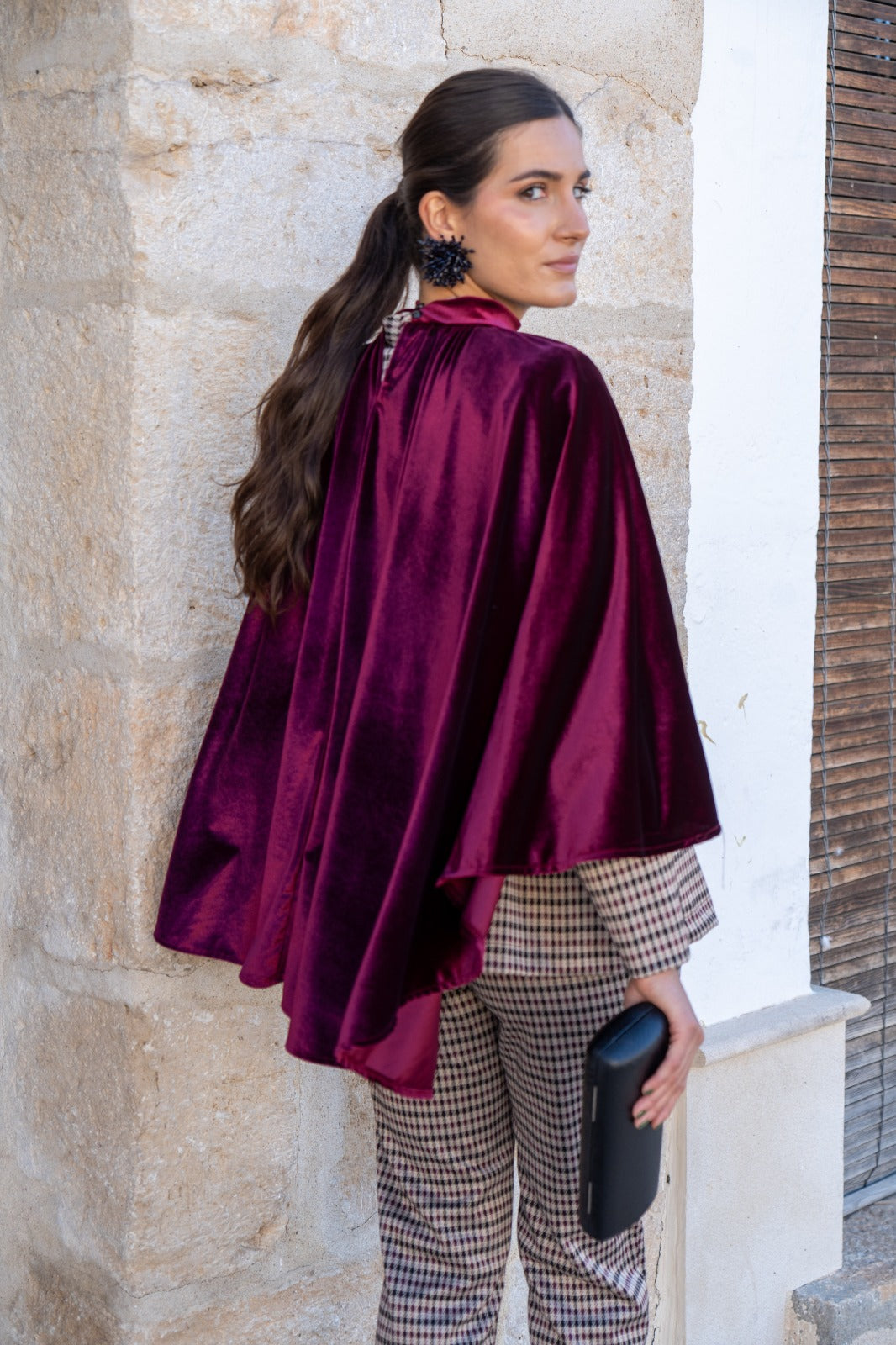 Capa corta, en terciopelo, cuello perkins, abierta en la parte delantera, cerrada por la parte trasera, abrochada con dos botones. En color burdeos.