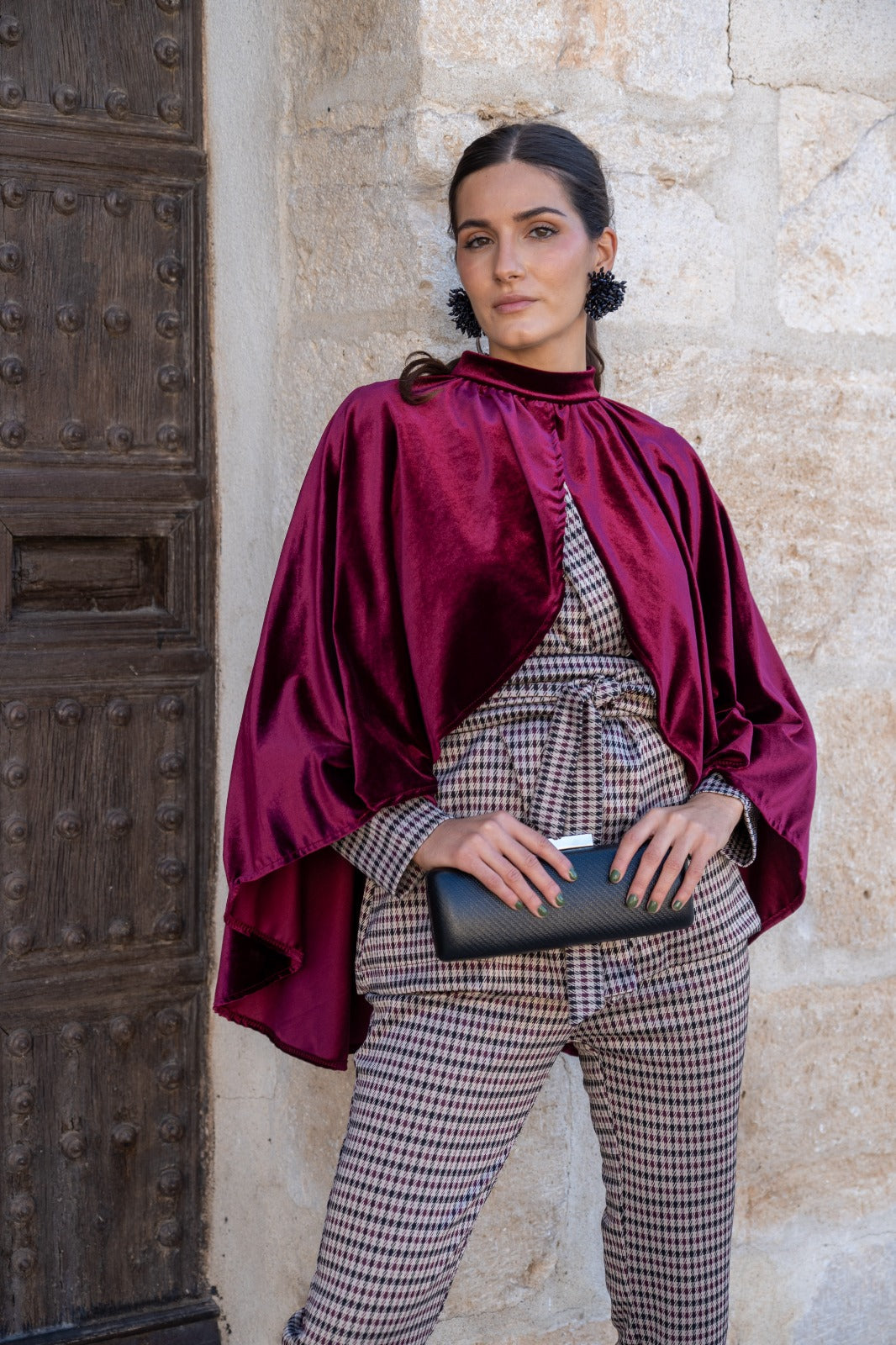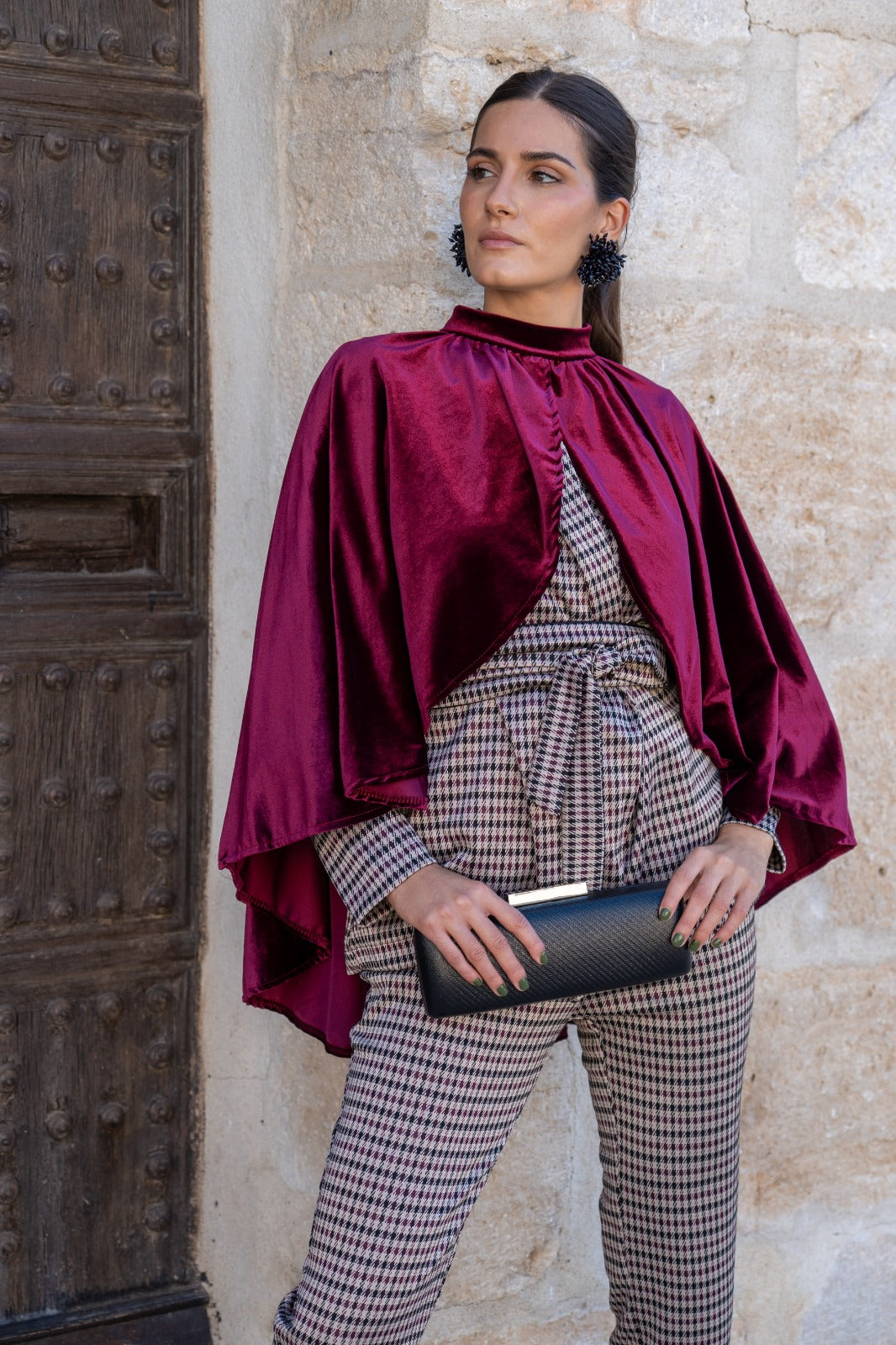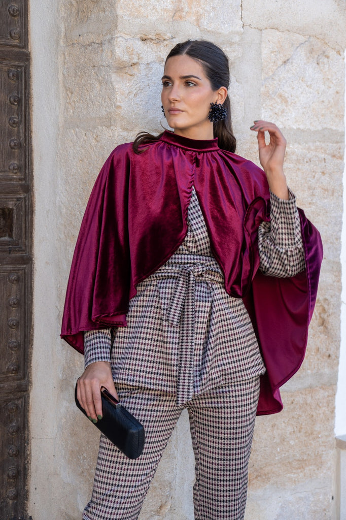 Capa corta, en terciopelo, cuello perkins, abierta en la parte delantera, cerrada por la parte trasera, abrochada con dos botones. En color burdeos.