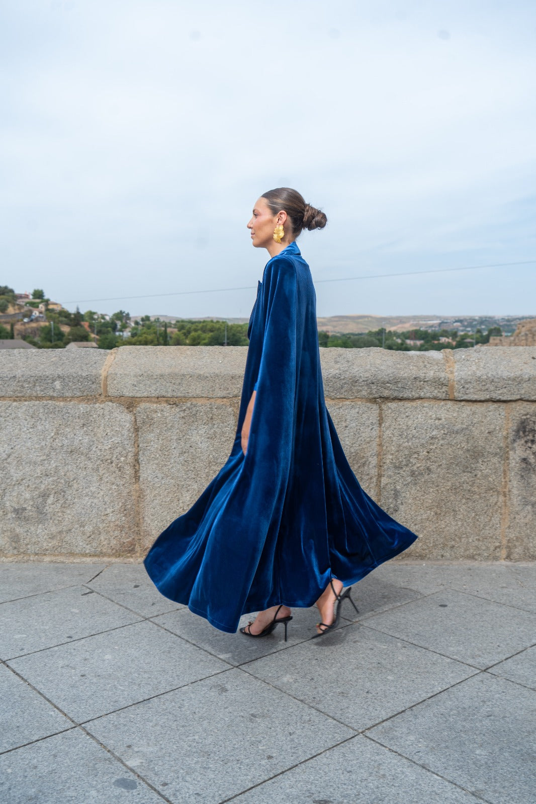 Capa en terciopelo, con cuello, abertura para poder sacar los brazos. En color azul.