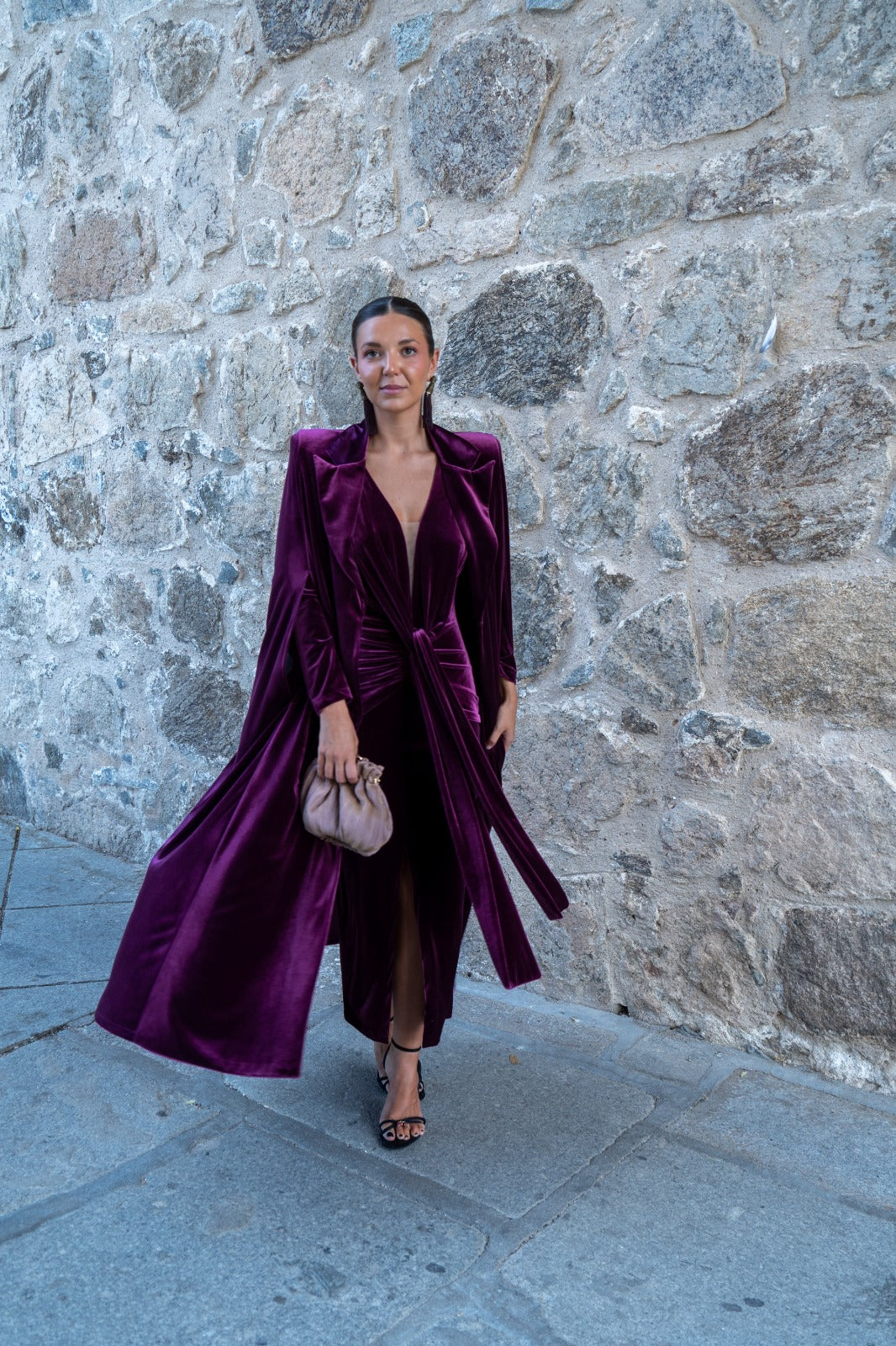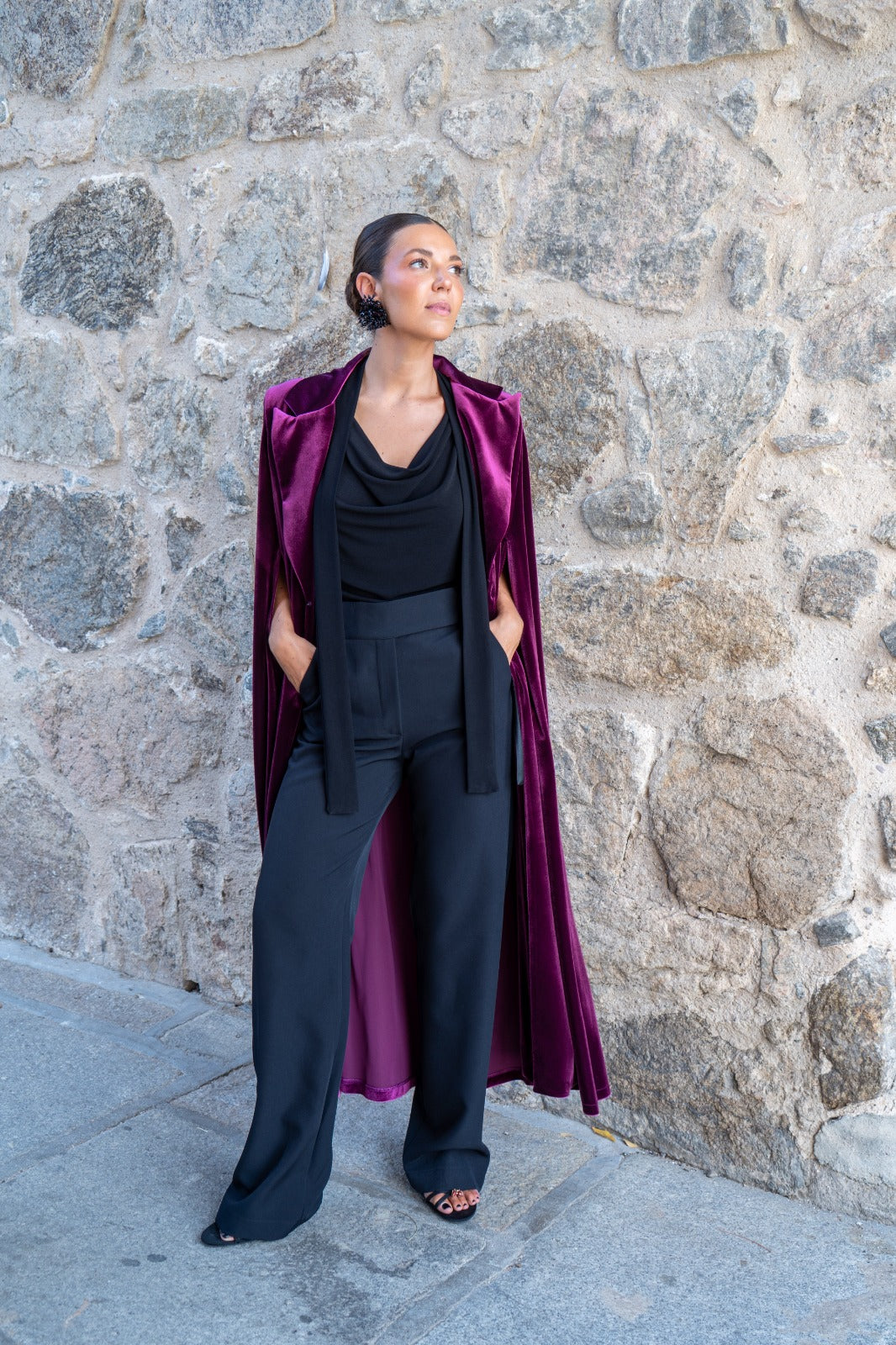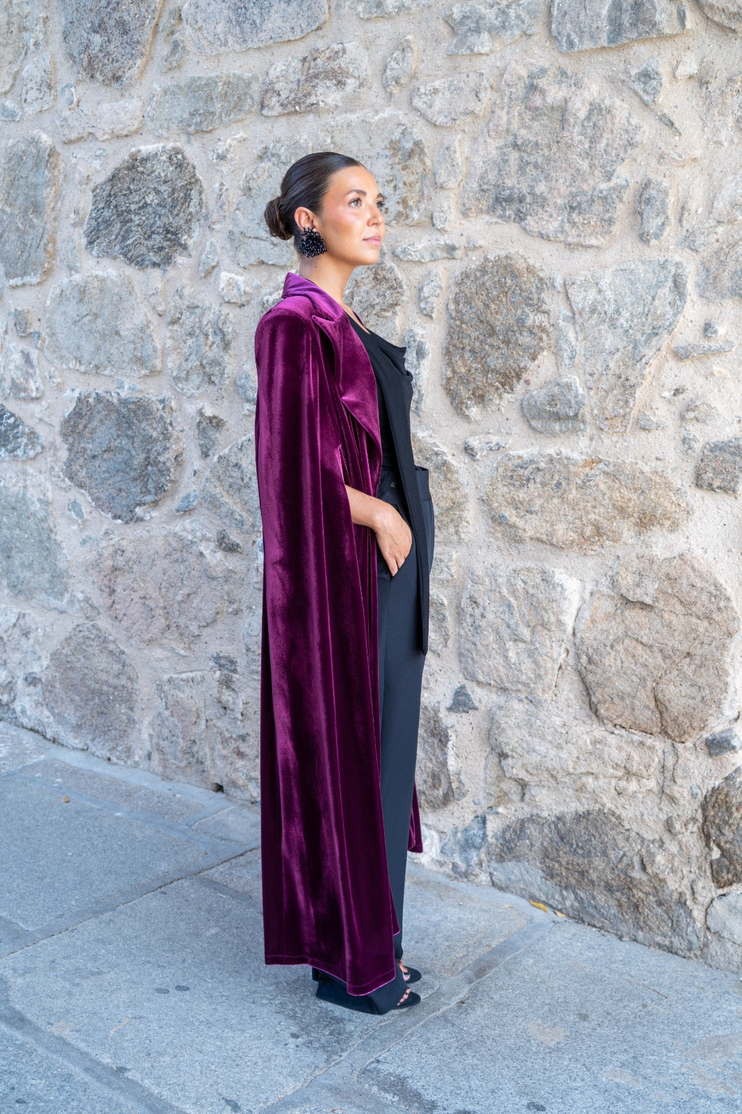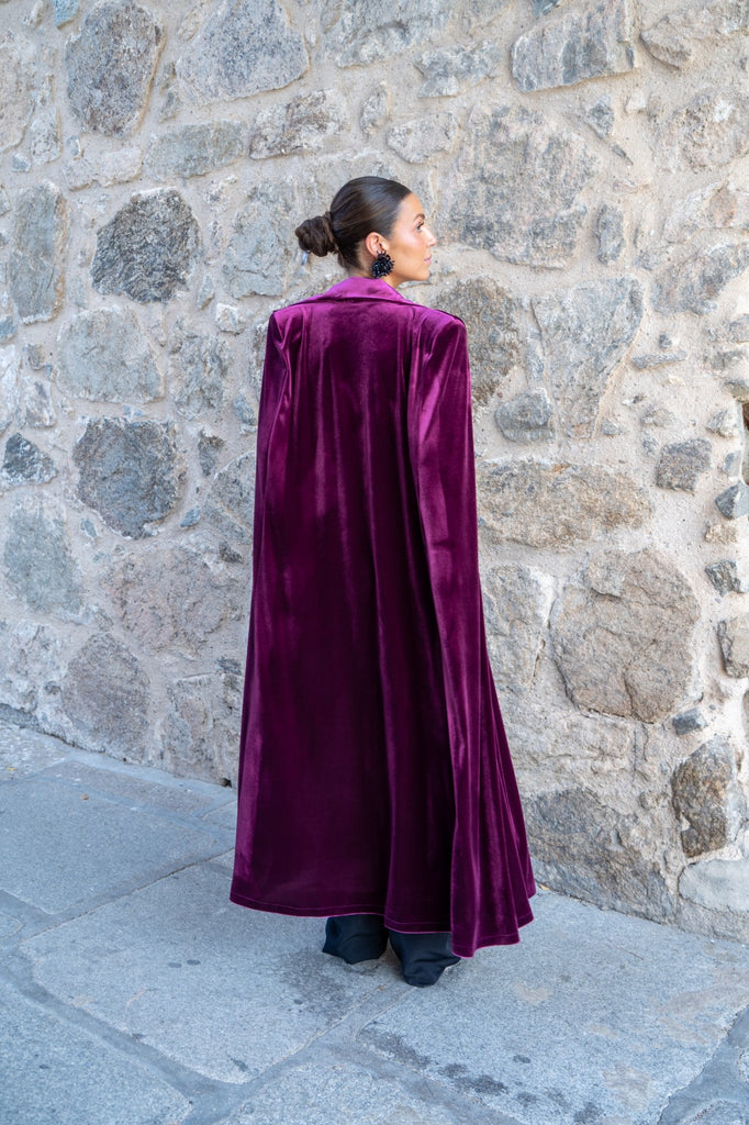 Capa en terciopelo, con cuello, abertura para poder sacar los brazos. En color burdeos.