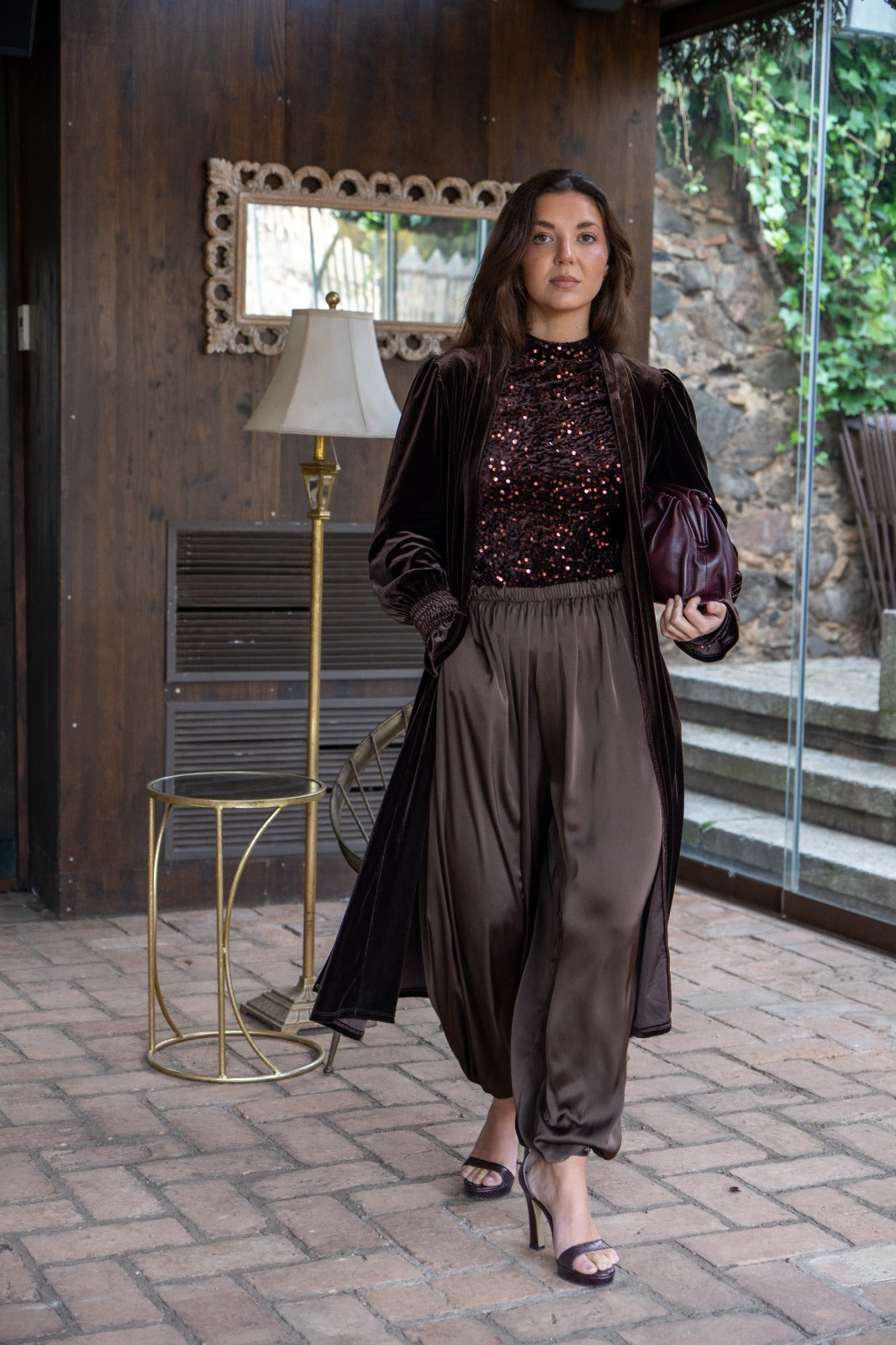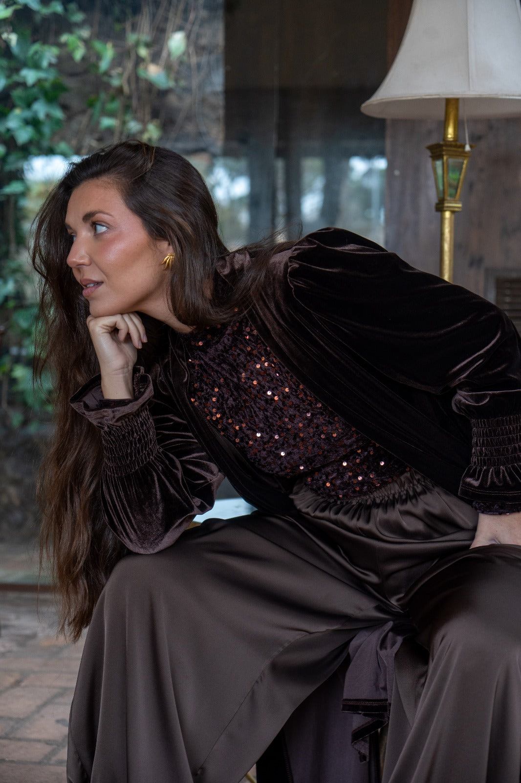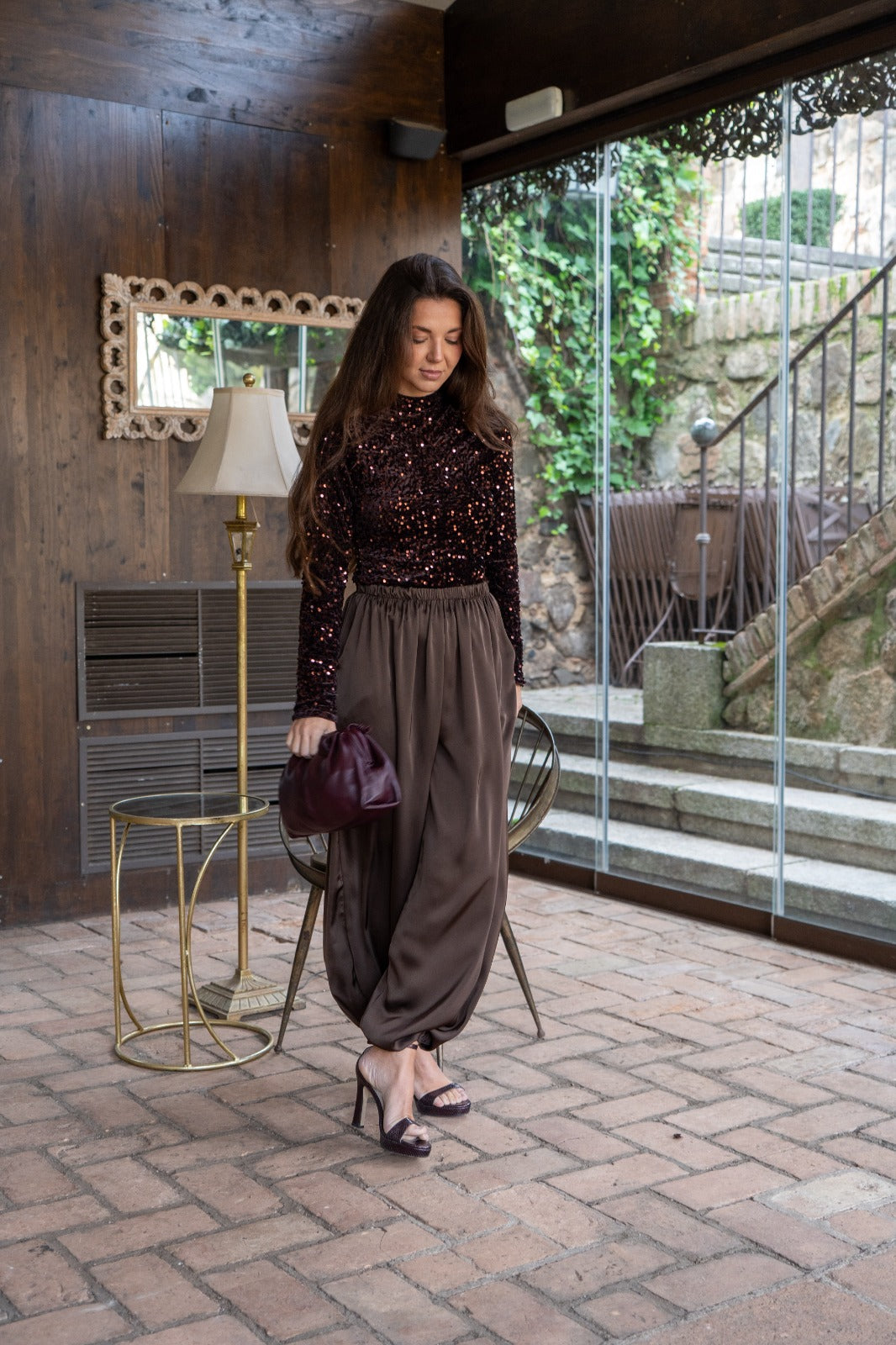 Halter neck bodysuit, long sleeves, in brown with sequins.