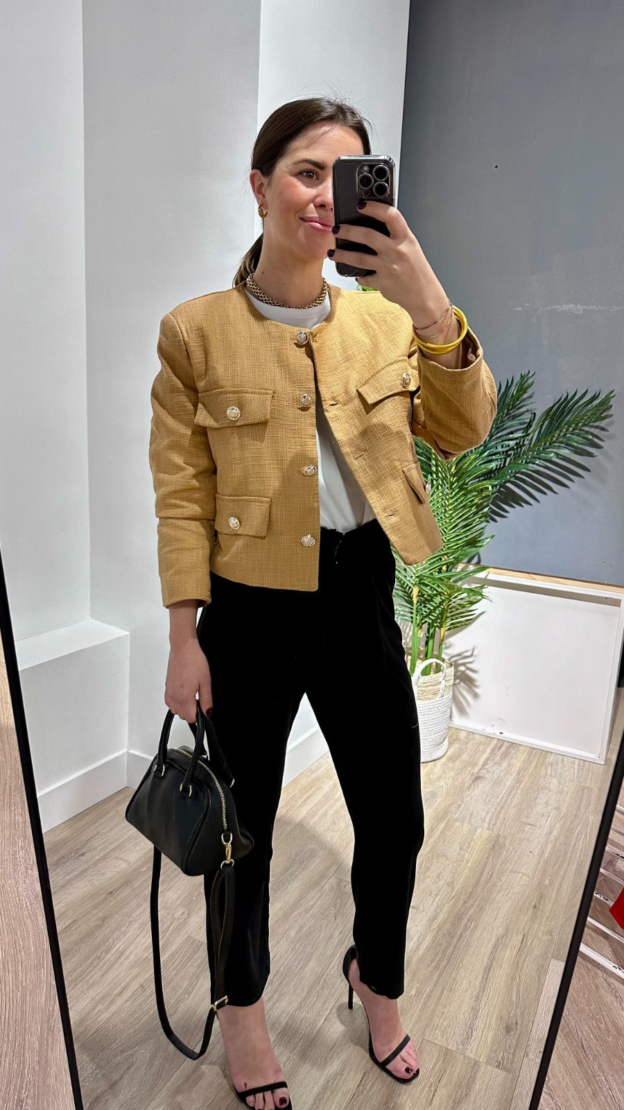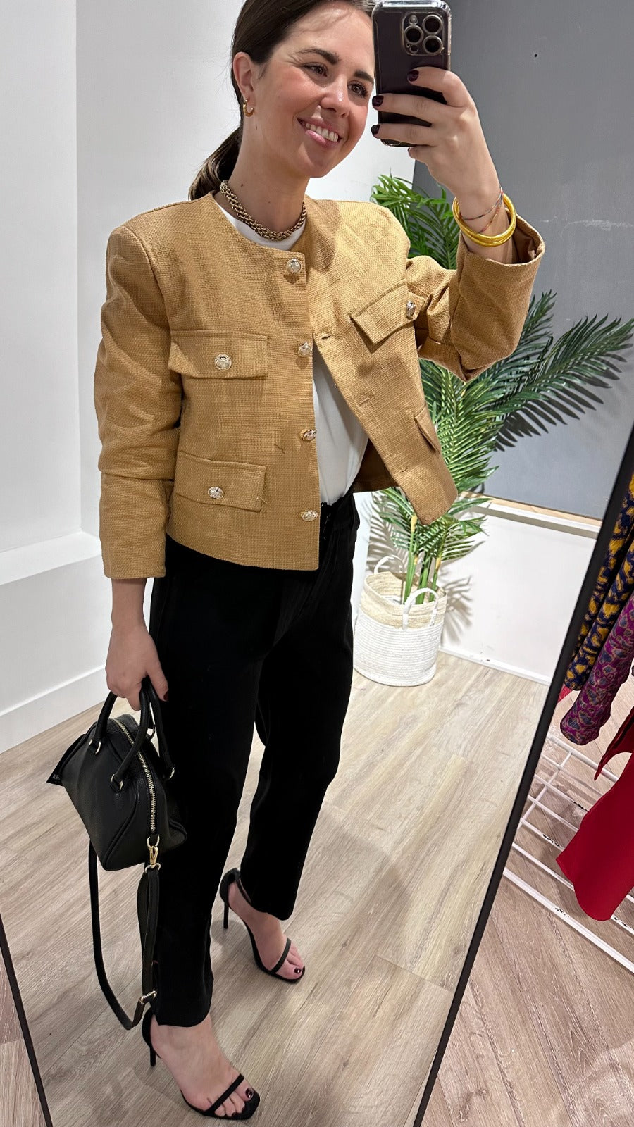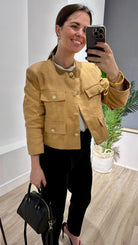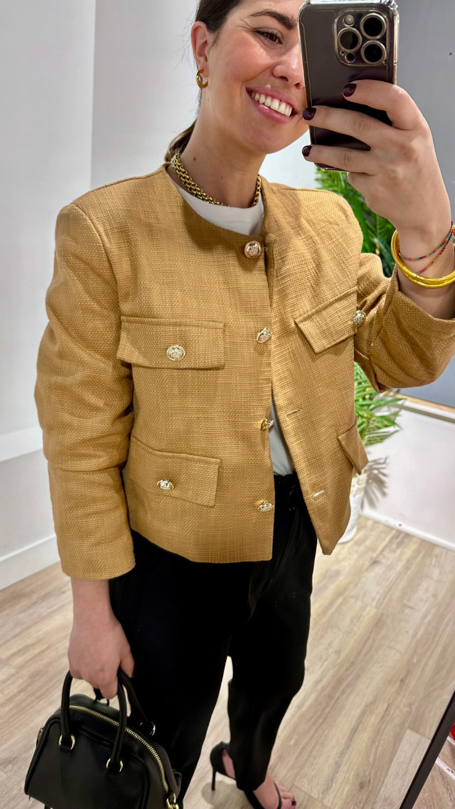Short jacket, round neckline, long sleeves, imitation pocket flaps with buttons, buttoned. In camel color.
