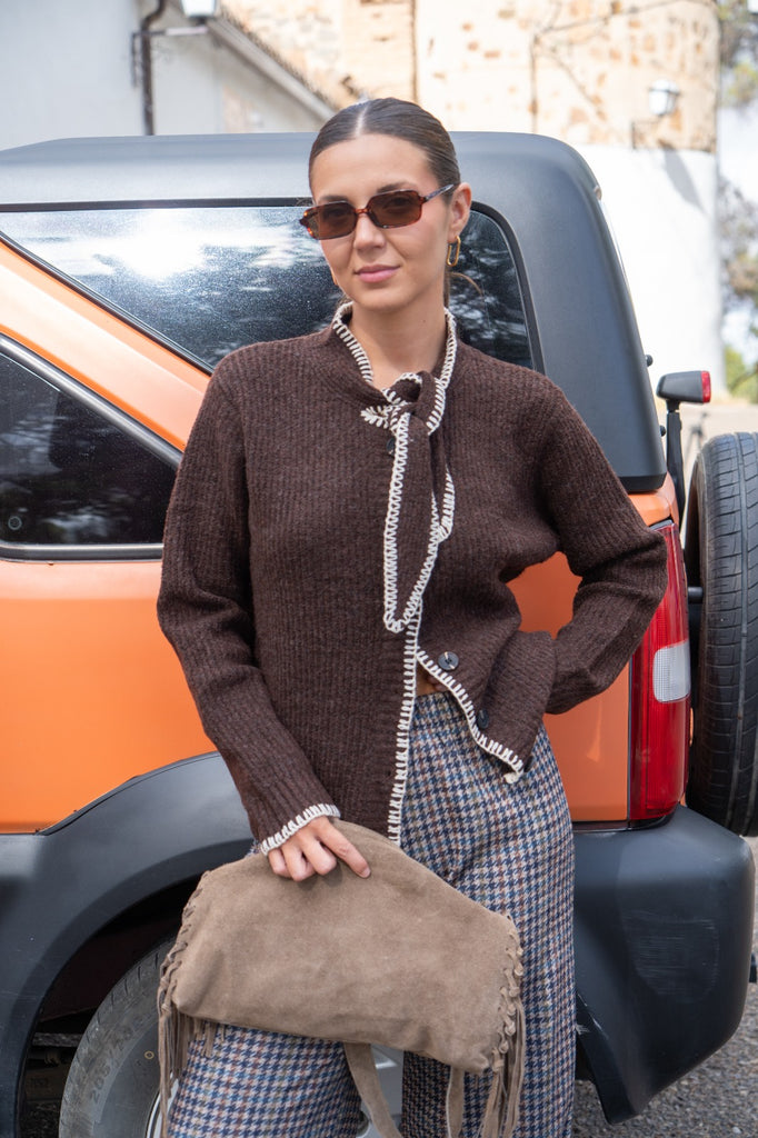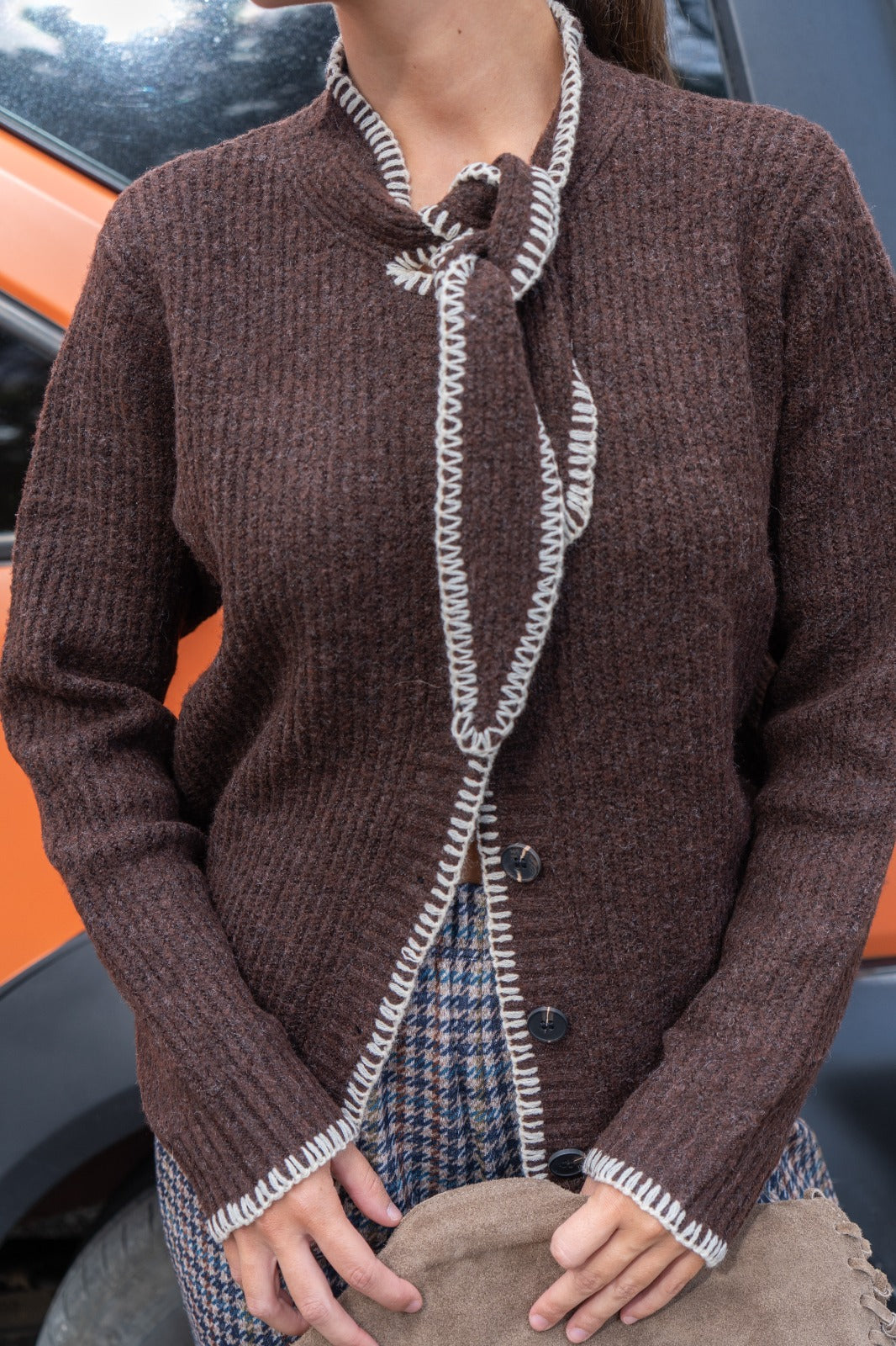 Chaqueta en punto, abotonada, lazo en cuello para anudar, en color marrón con detalle pespuntes blancos.