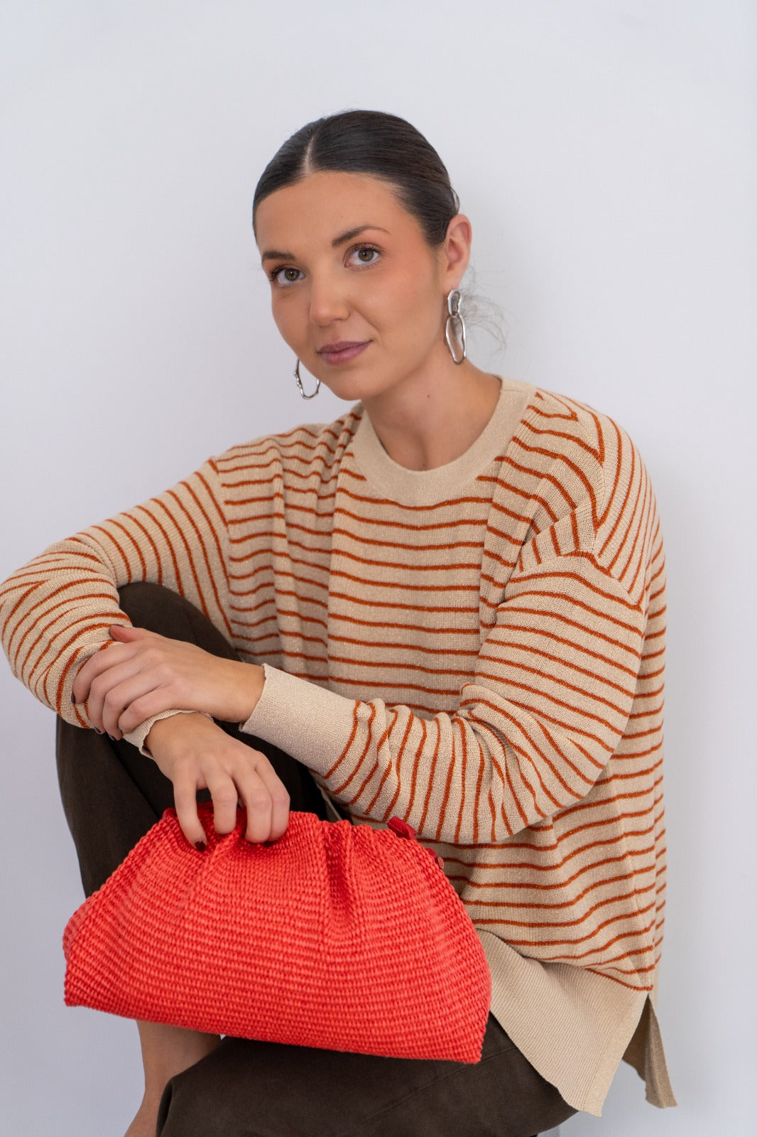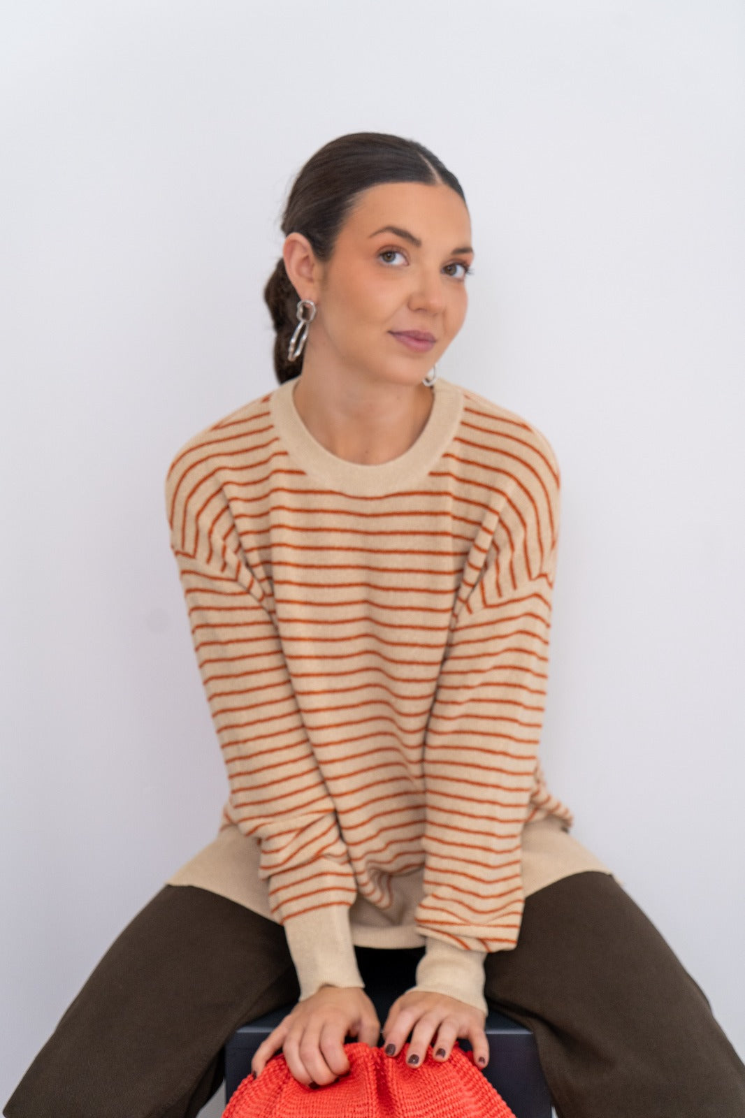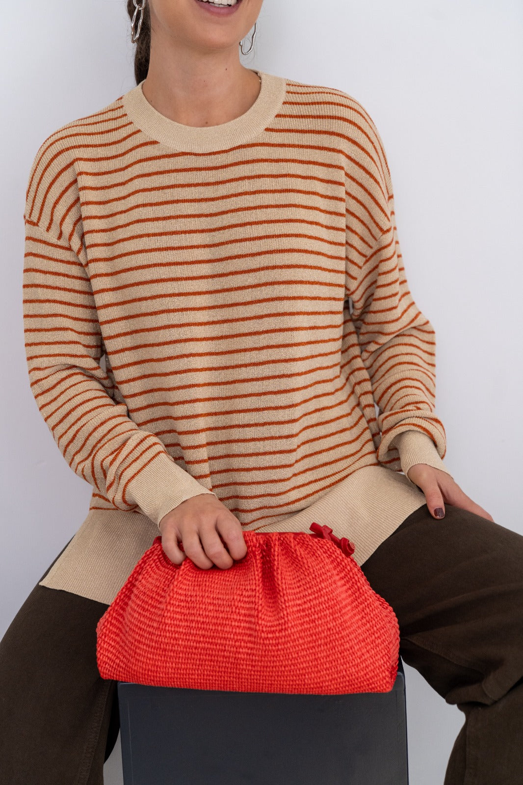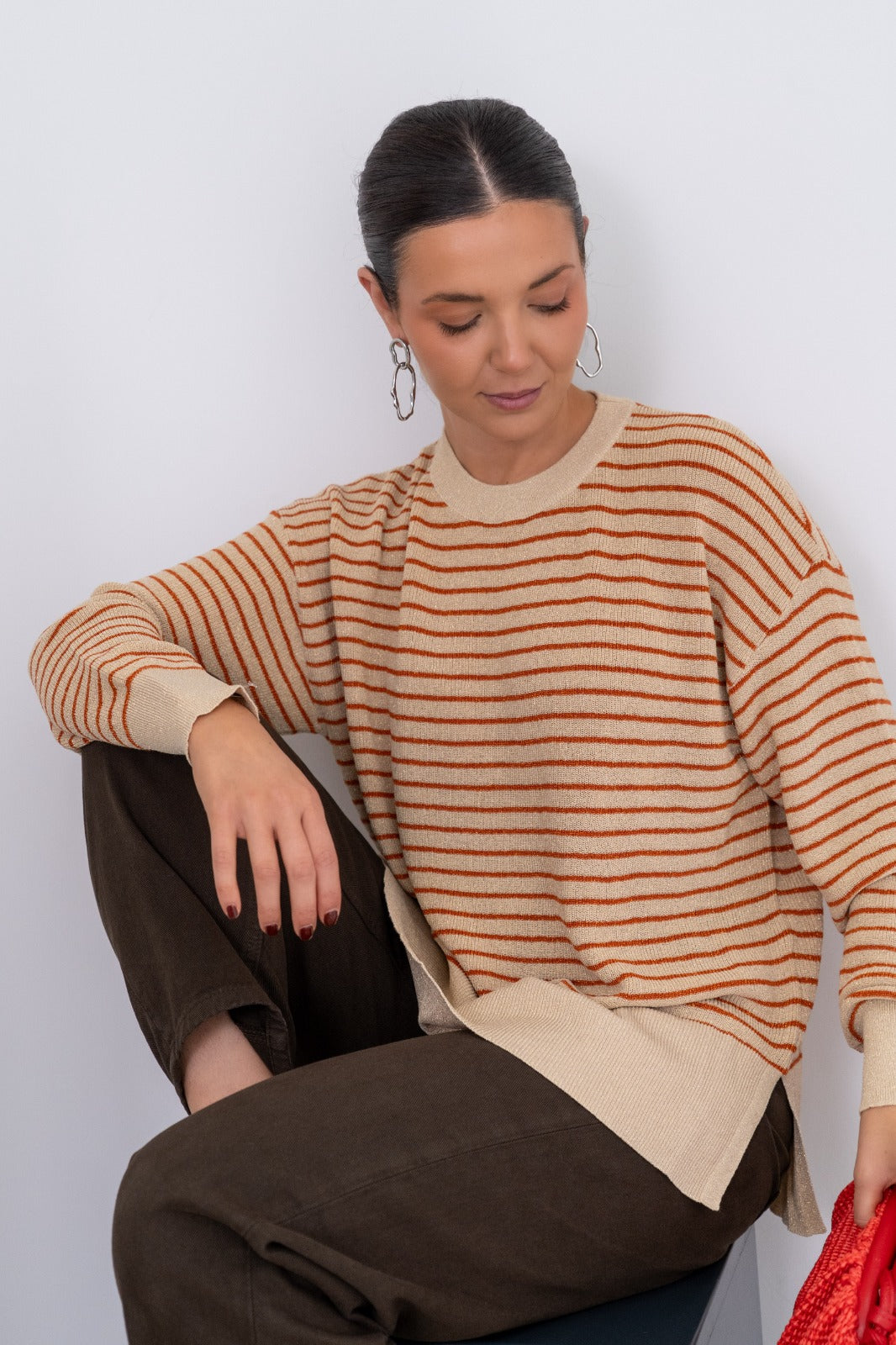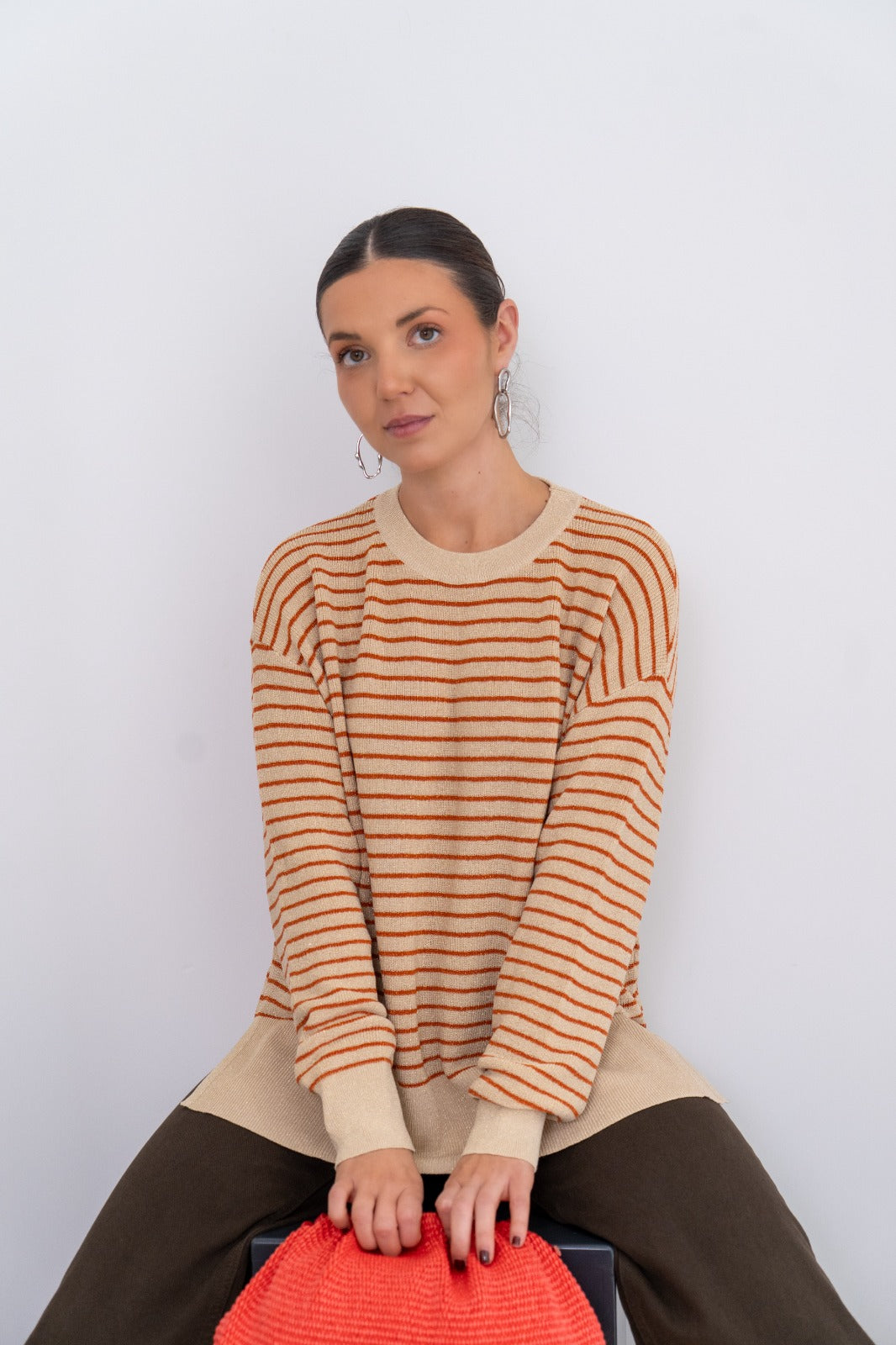 Jersey cuello redondo, manga larga, aberturas laterales, con caída. En color beige con rayas naranjas y lurex dorado.