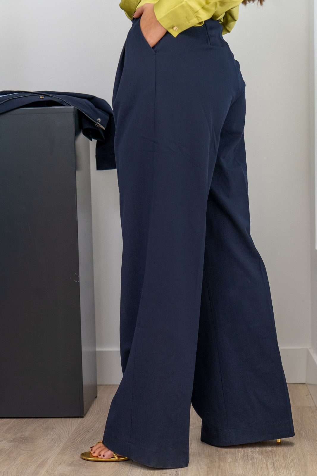 Pantalón tiro alto, bolsillos laterales, pinzas delanteras. En color marino.