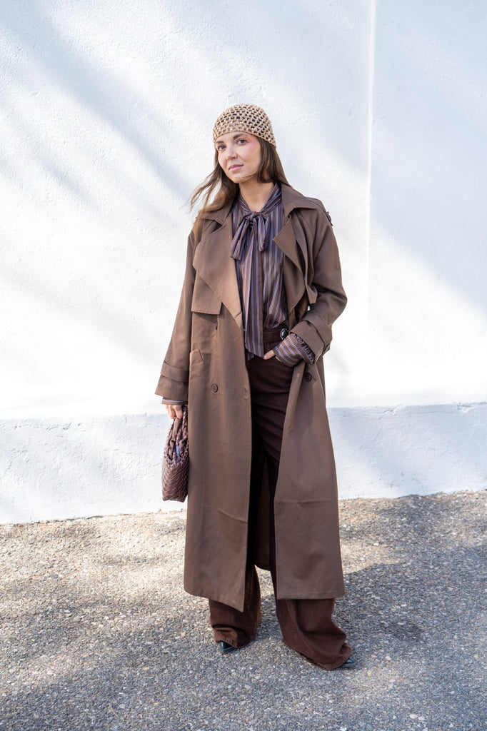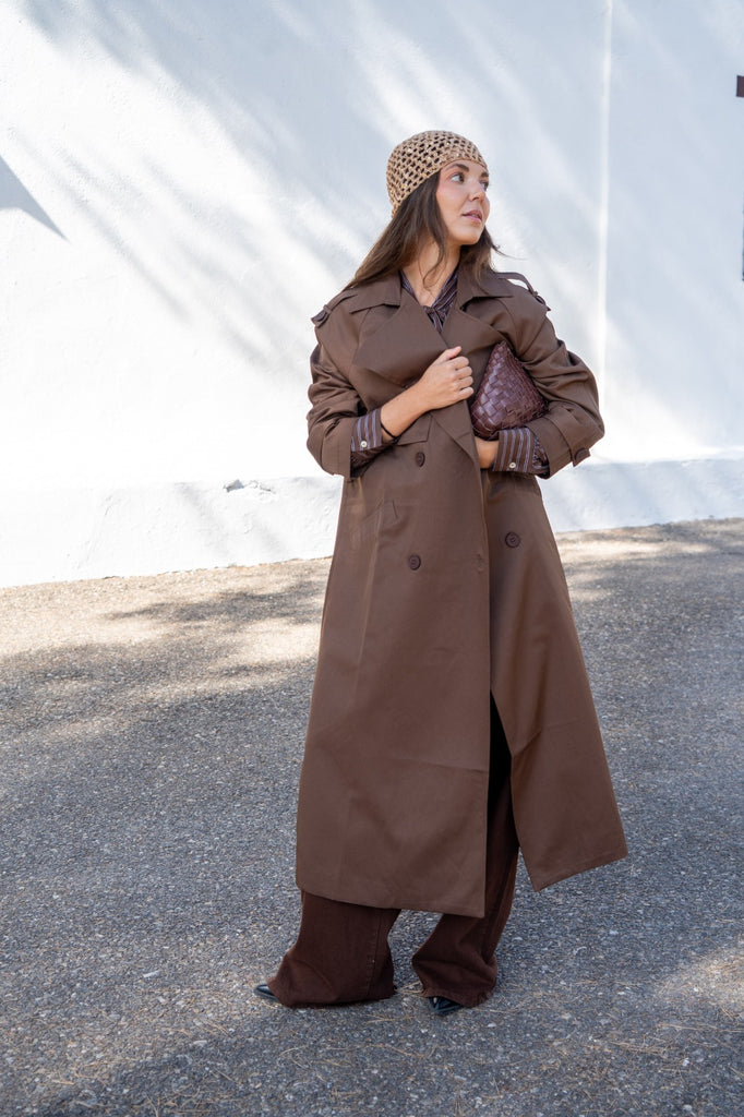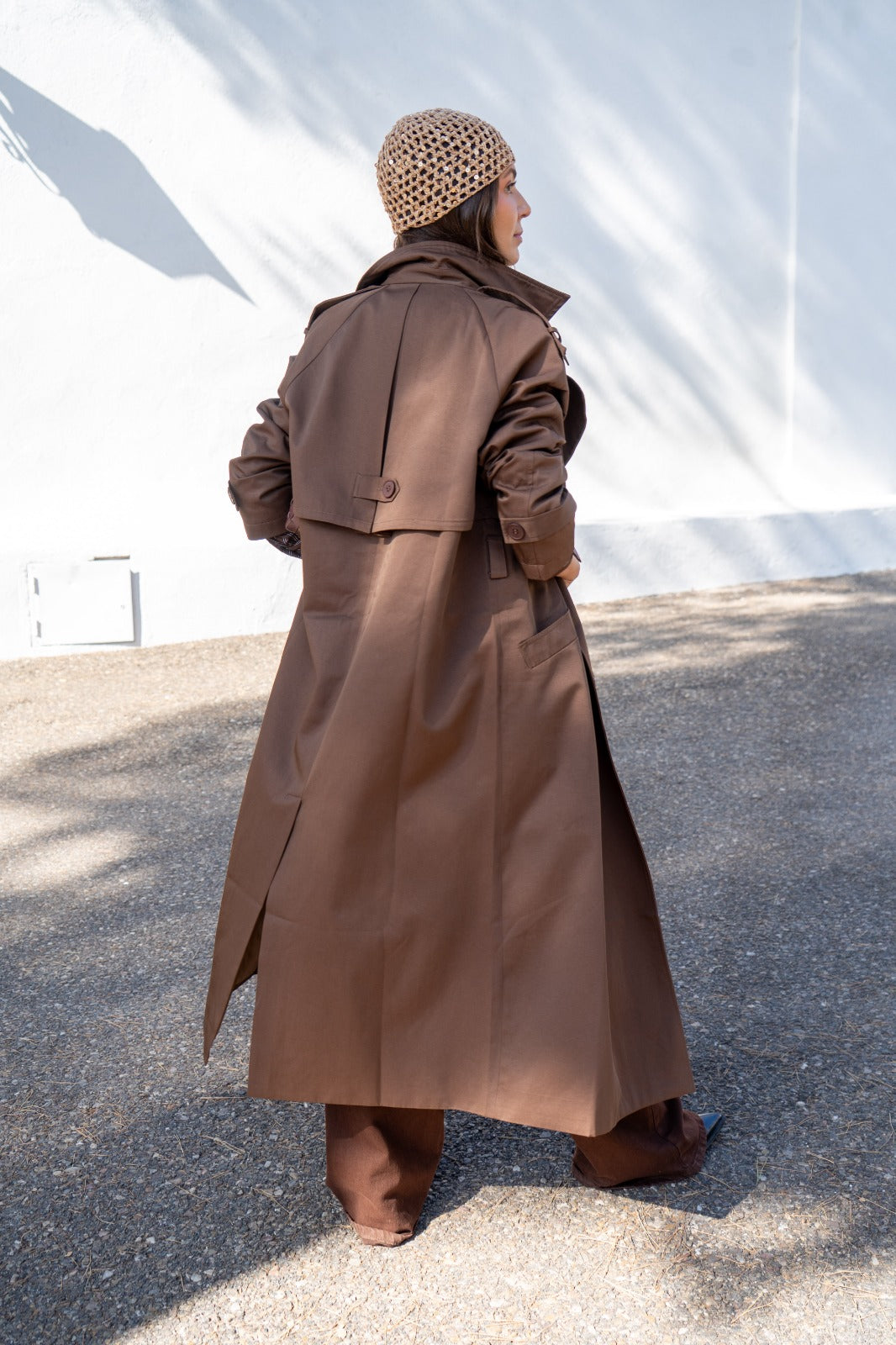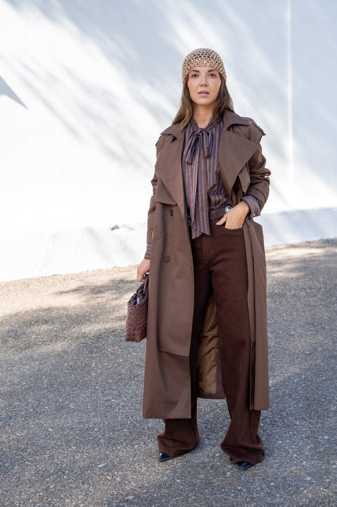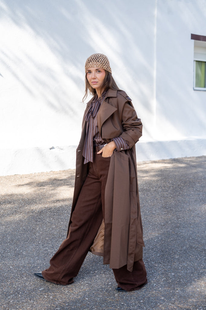 Gabardina abotonada, bolsillos laterales, cinturón, abertura trasera, forrada. En color marrón.