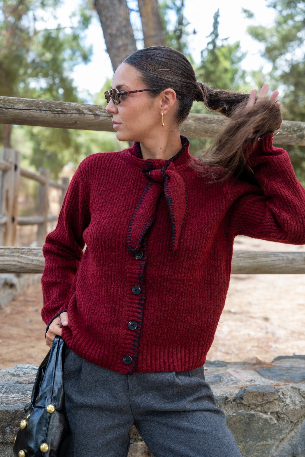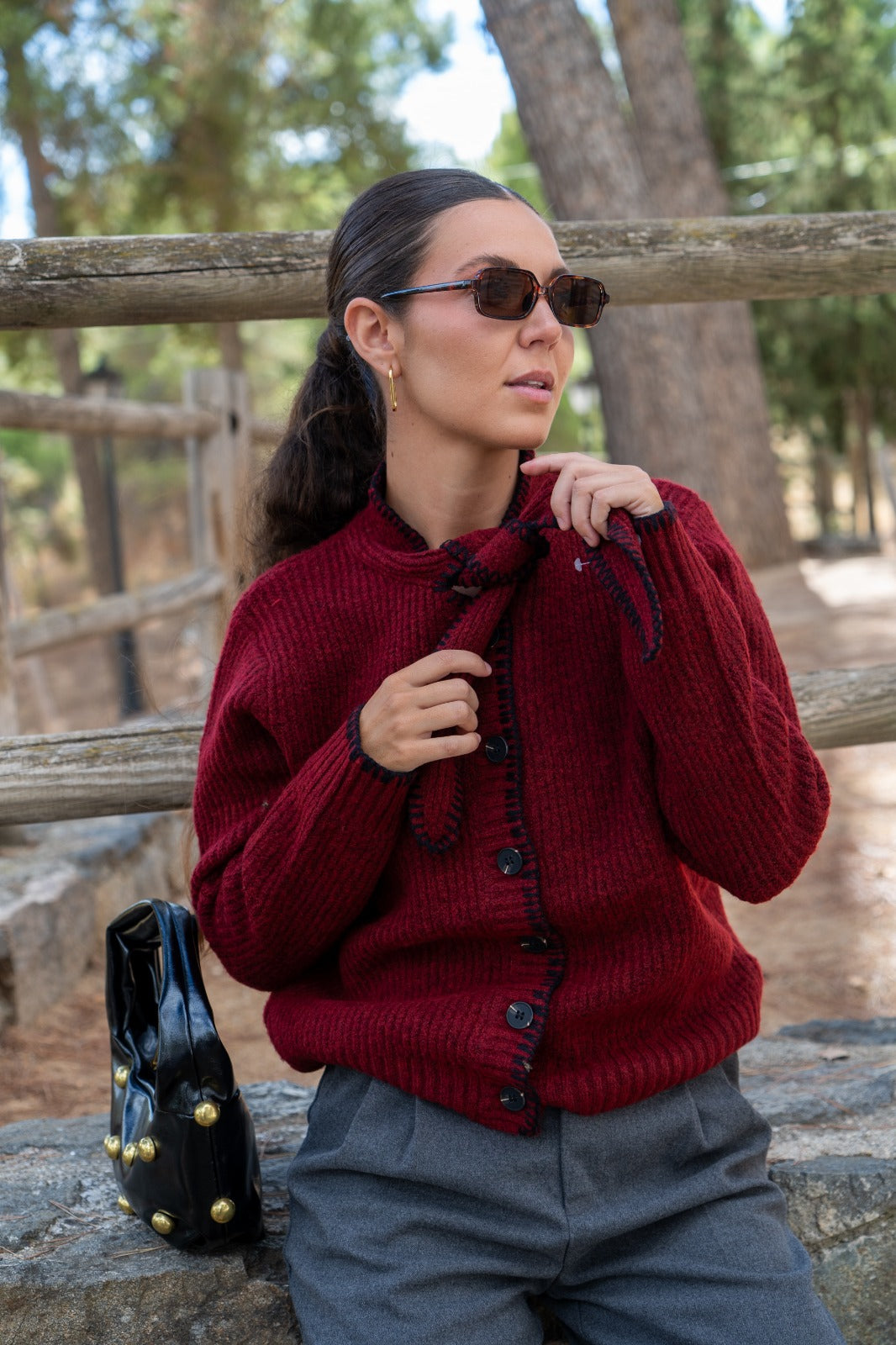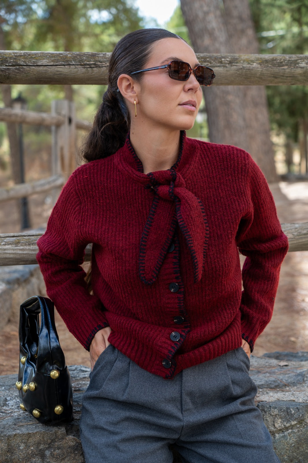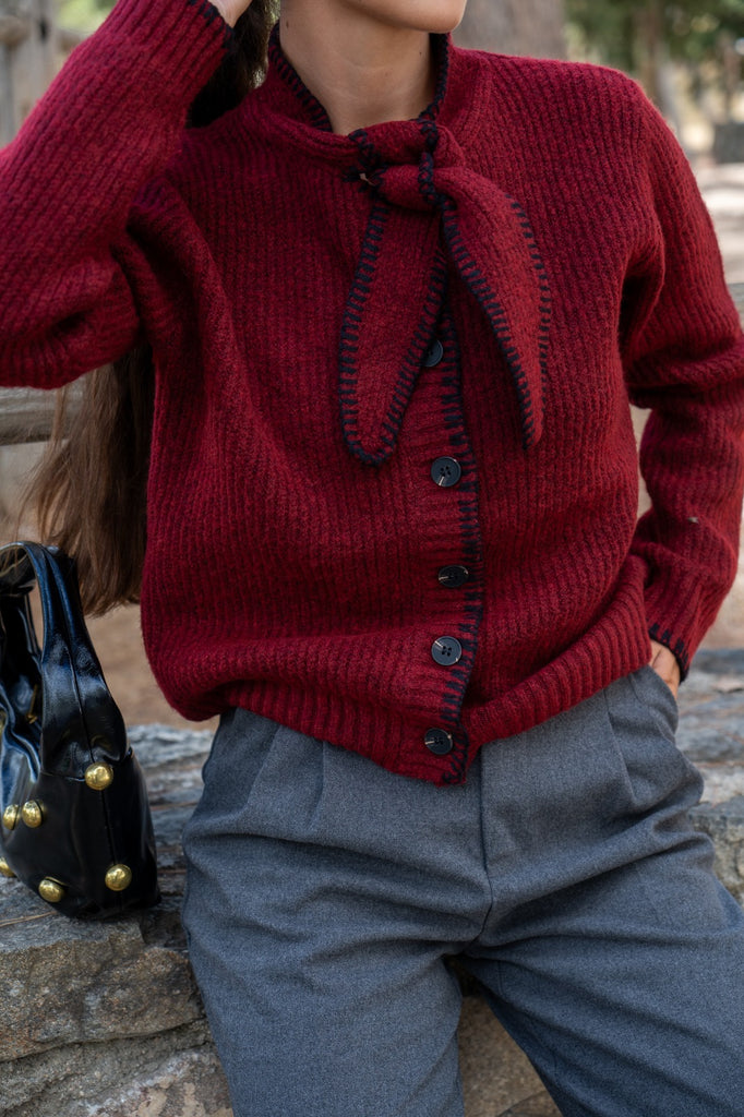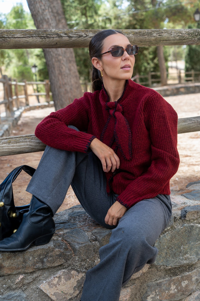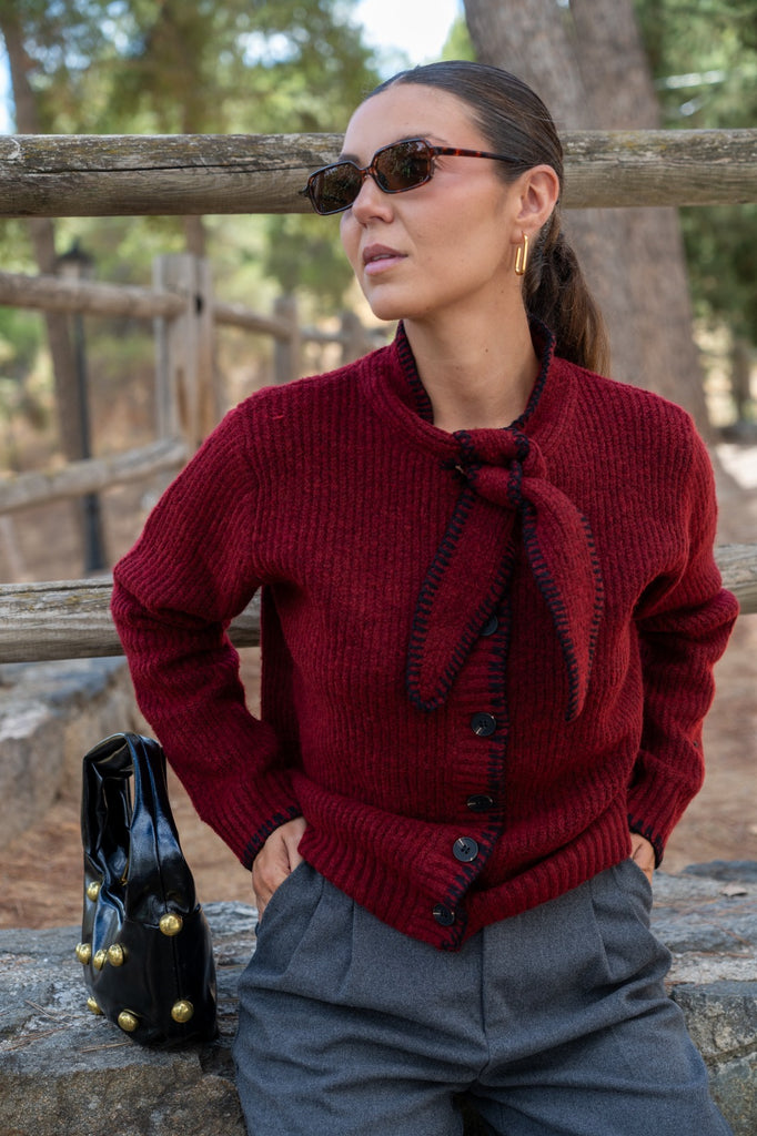 Chaqueta en punto, abotonada, lazo en cuello para anudar, en color burdeos con detalle pespuntes negros.
