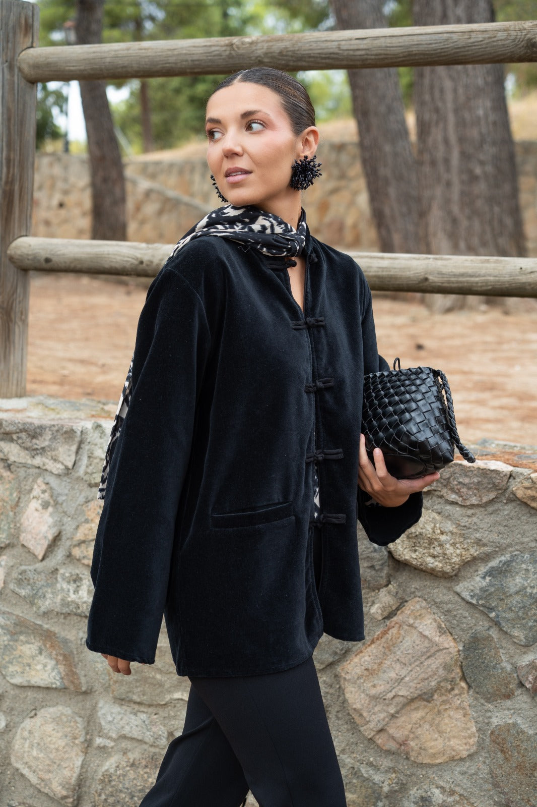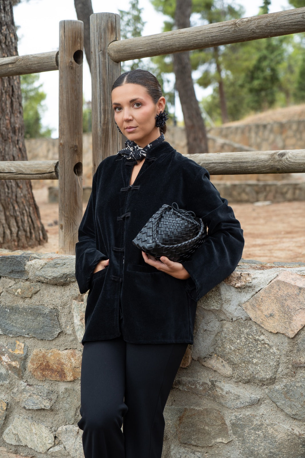 Kaftan recto, aberturas a los lados, manga larga, bolsillos delanteros. En terciopelo color negro.