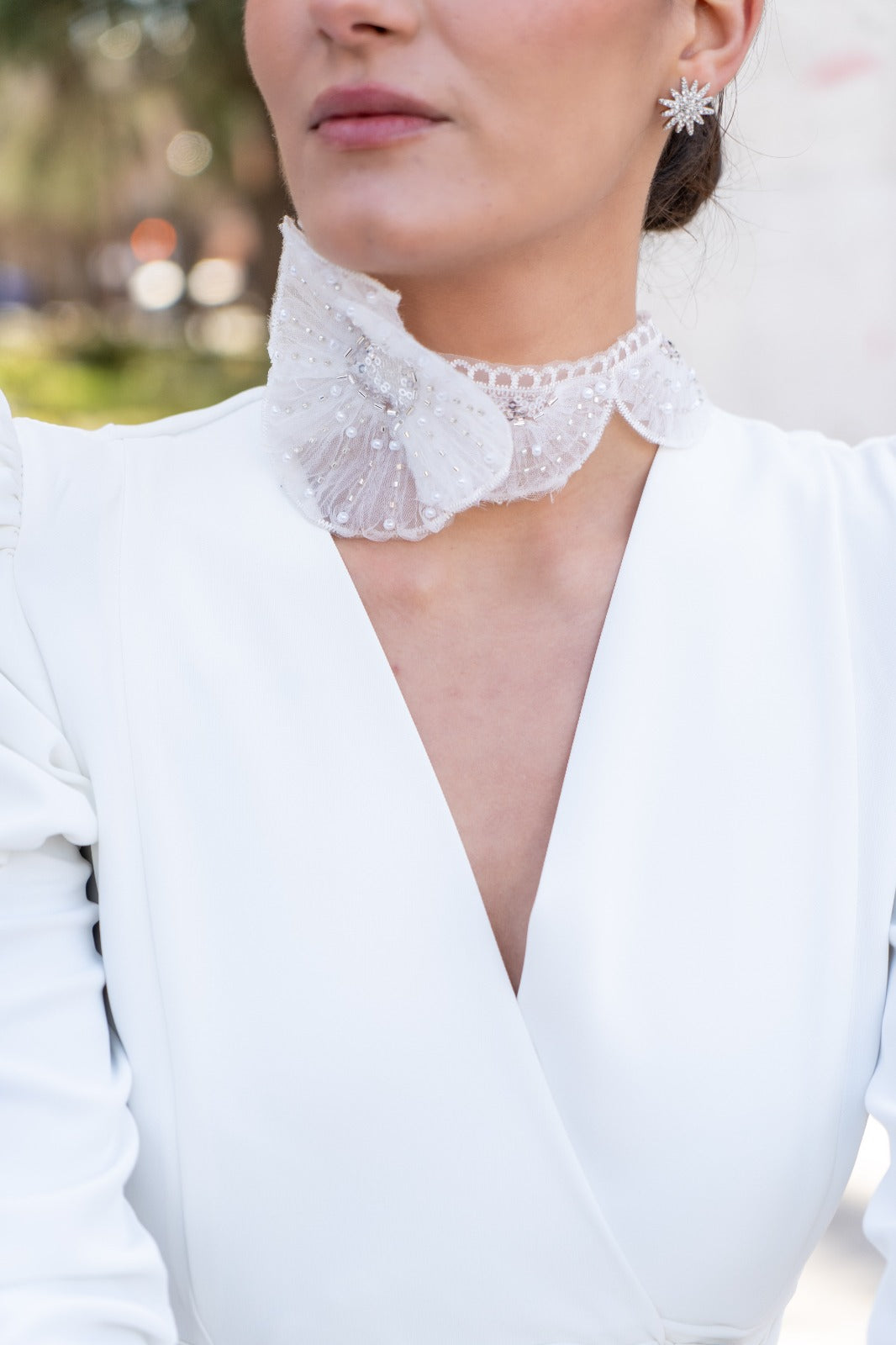 Choker with perfectly embroidered circular petals. The clean, contemporary design combines the delicacy of the embroidery with a powerful visual structure, creating a piece with a serene personality.