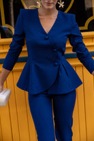Set consisting of a long-sleeved, double-breasted jacket with buttons and peplum detail. High-waisted trousers with a waistband. In blue.