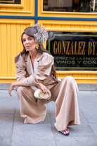 Set consisting of a jacket with a lapel, a belted double-breasted jacket, puffed sleeves, and high-waisted, wide-leg trousers. In beige.