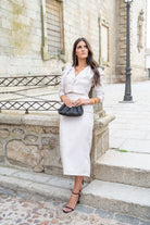 The model is 1.64cm tall and is wearing a size 36. This dress fits true to size.