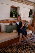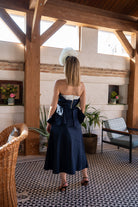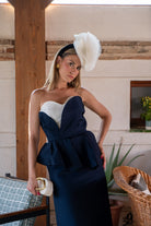 Set featuring a sweetheart neckline top with asymmetrical ruffles and a flared midi skirt. Available in navy and white.
