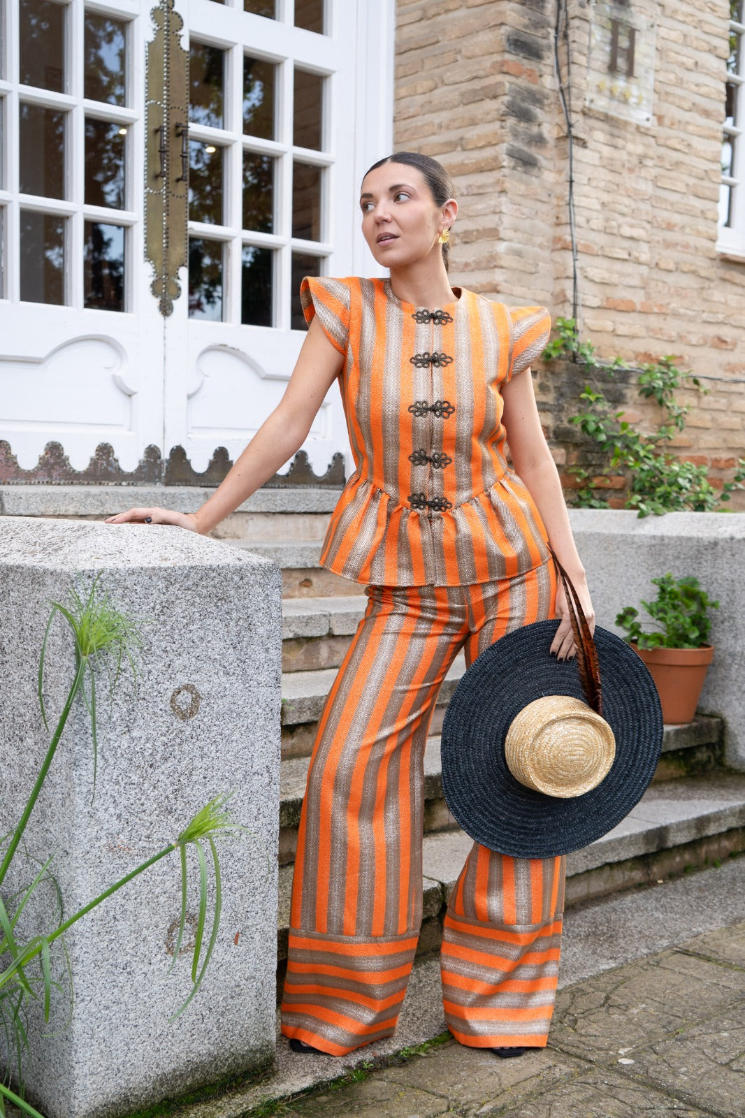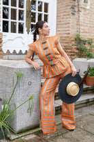Set featuring a sleeveless jacket with structured shoulders and a front button closure and peplum. Straight-leg pants with a flattering fit and horizontal stripe detailing at the hem. Featuring an orange and earth-tone striped print.