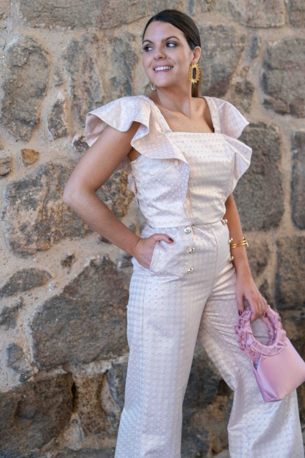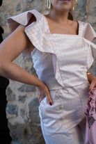 Set featuring a cropped top with a square neckline and ruffled shoulders, and high-rise pants with a side zipper and front button detail. In pink with a lurex print.