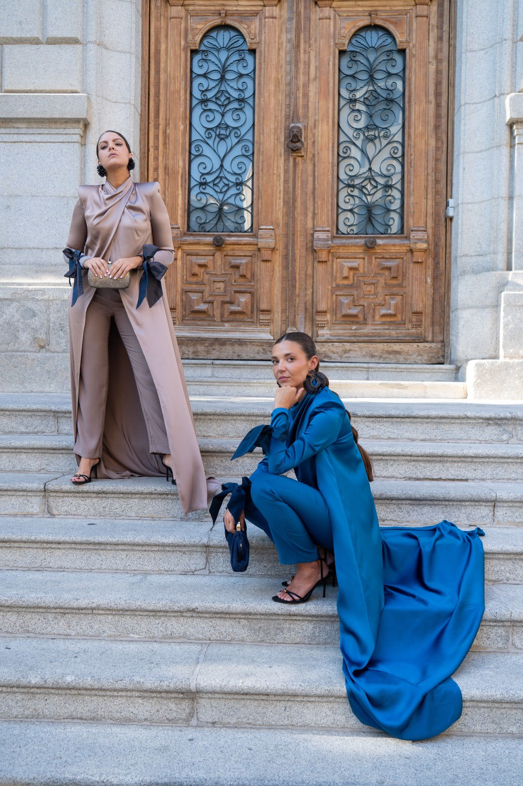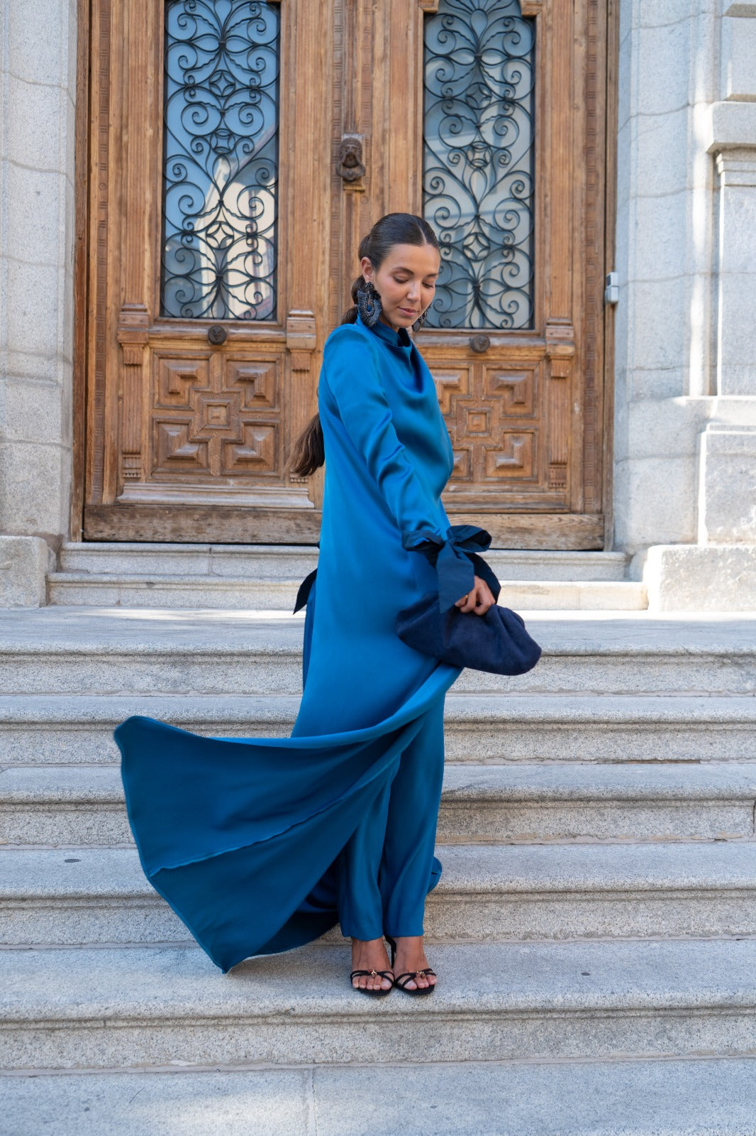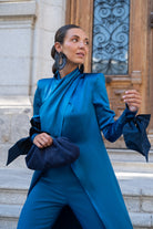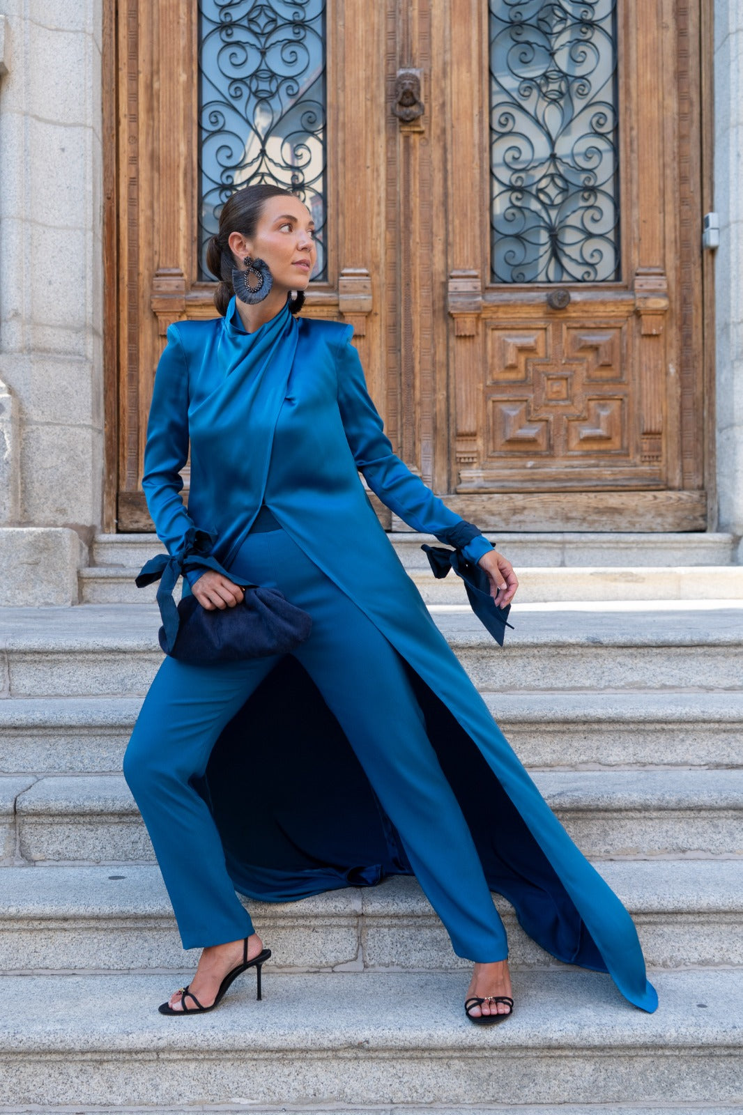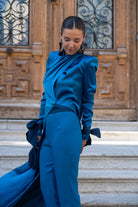 Set consisting of a kaftan open at the top, crossed at the neck, long sleeves with taffeta trim finished in a bow, and straight-leg trousers, high-waisted, with a taffeta waistband. In blue.
