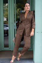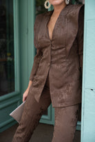 A matching set consisting of a button-up jacket with long sleeves, shoulder plackets, and straight-leg, high-waisted trousers. Brown with brocade detailing.