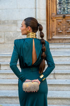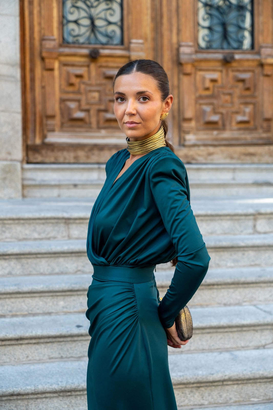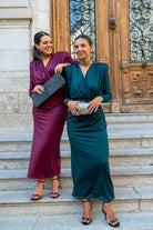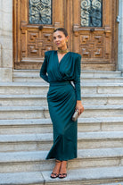 Set consisting of a bodysuit with a crossover neckline, long sleeves, structured shoulders, and a straight, draped skirt with a waistband. In green.