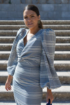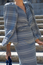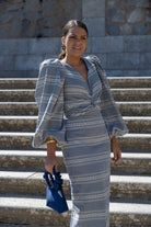 Set featuring a V-neck blouse with a knot, maxi puff sleeves, and a high-waisted pencil skirt. Available in navy and white.