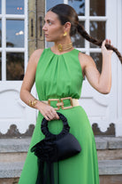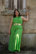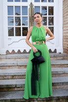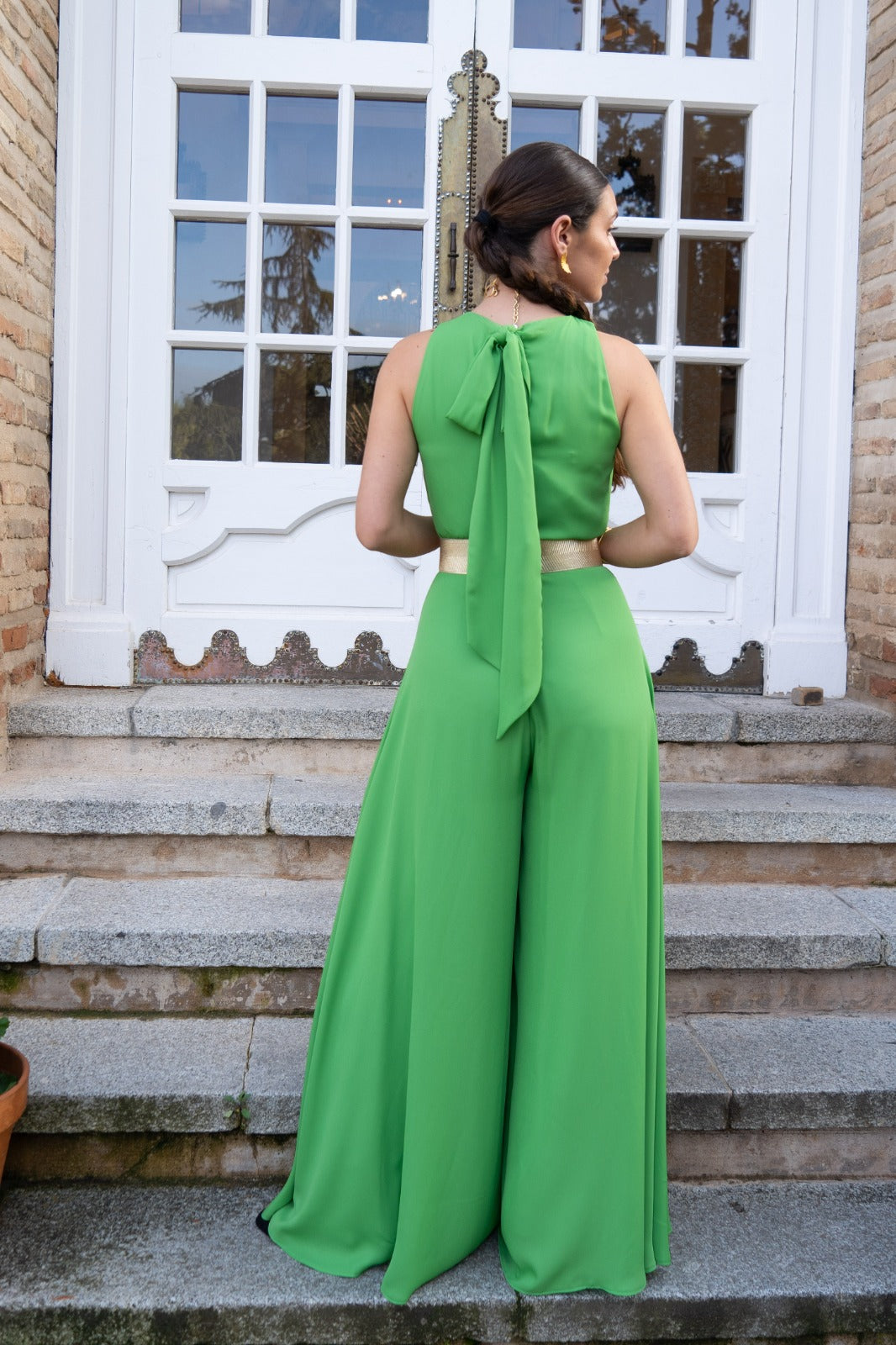 Round-neck jumpsuit, tied at the back, sleeveless, waist-cut, belt included, and wide-legged trousers. In green.