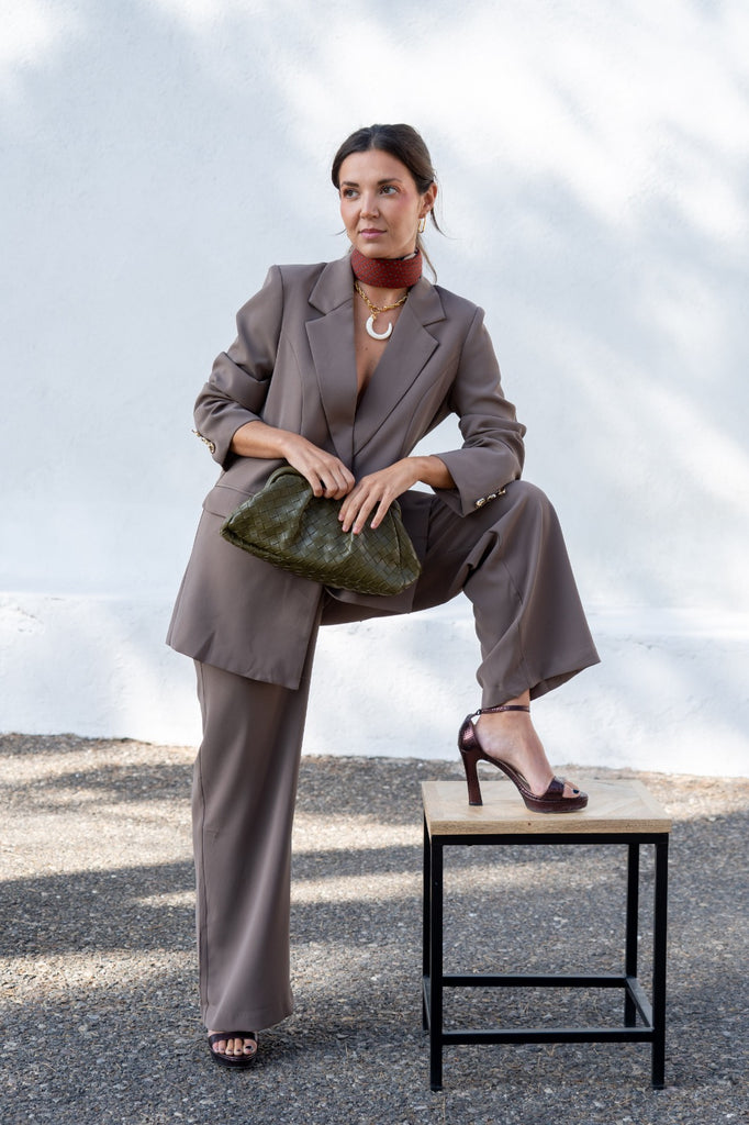 Conjunto compuesto por chaqueta, cuello solapa, bolsillos delanteros y pantalon ancho, bolsillos laterales. Tejido fluido en color verde.