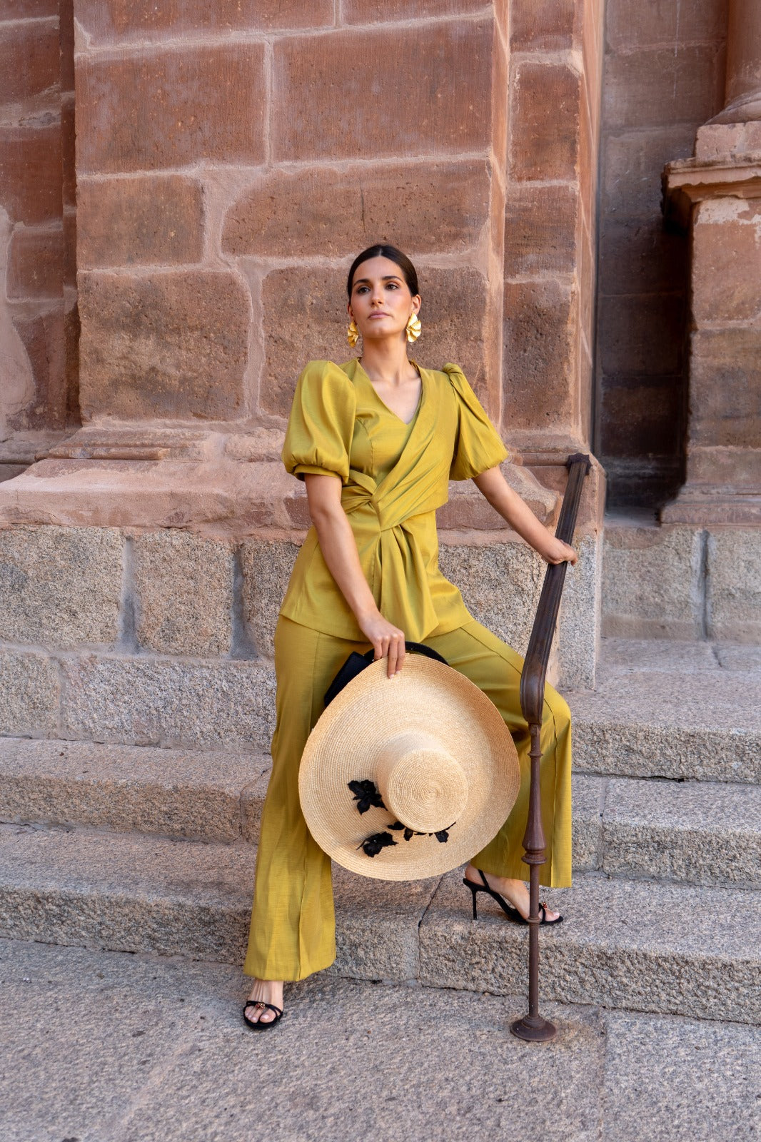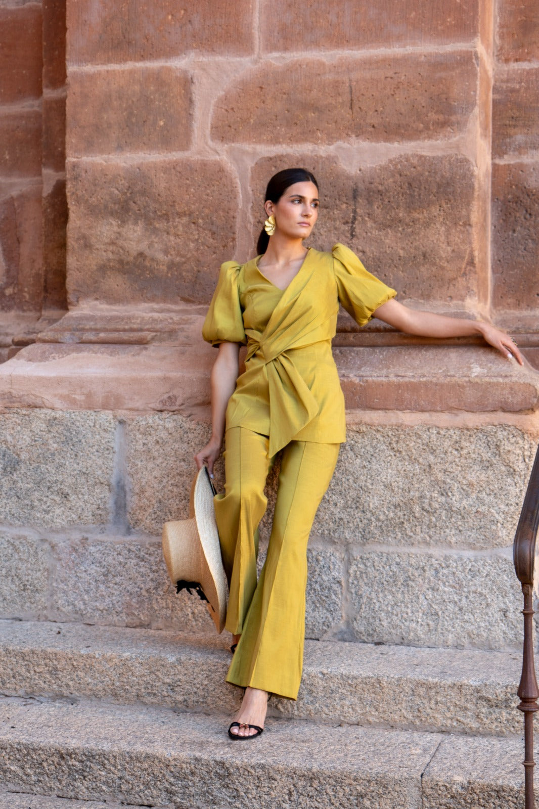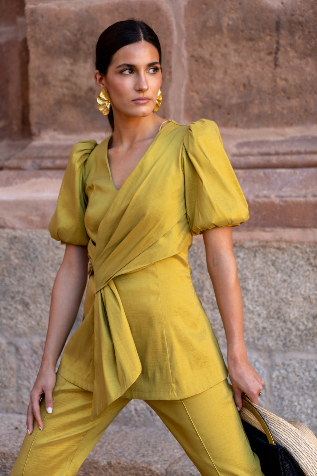 Set consisting of a V-neck blouse with puffed short sleeves, a bow detail on one side, and high-waisted trousers with a shaped hem. In mustard color.