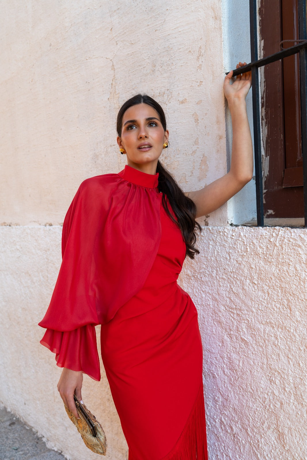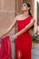 Midi dress, asymmetric neckline with wide shoulder pad, transparent detail on one side at the waist, asymmetric hem finished with fringes, chiffon overlay sleeve on one side buttoned to the neck. In red.