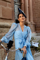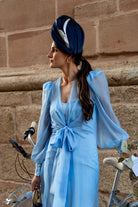 Strapless dress, sweetheart neckline, back slit with long coat, long chiffon sleeves, in blue.