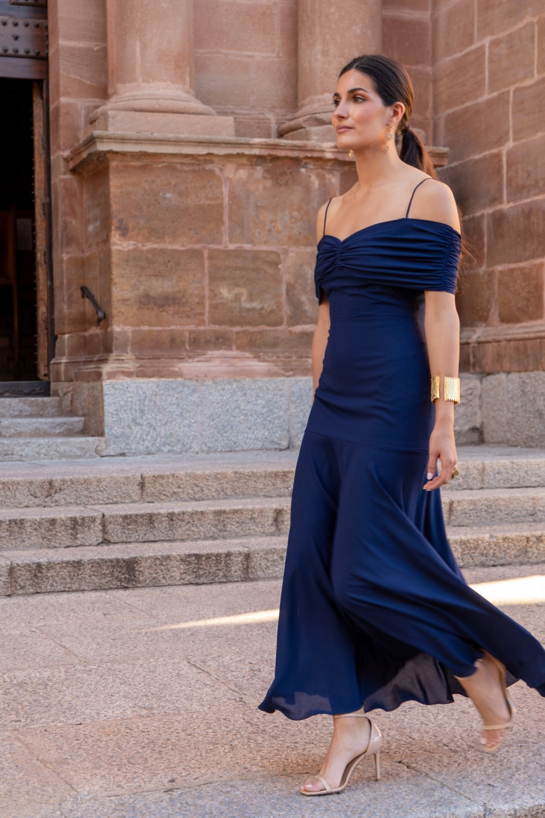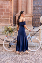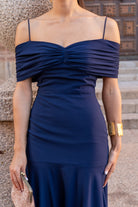 Midi dress made of light crepe with a bardot neckline with a draped piece that wraps around the body and arms, cut below the hip with a cape skirt. In blue.
