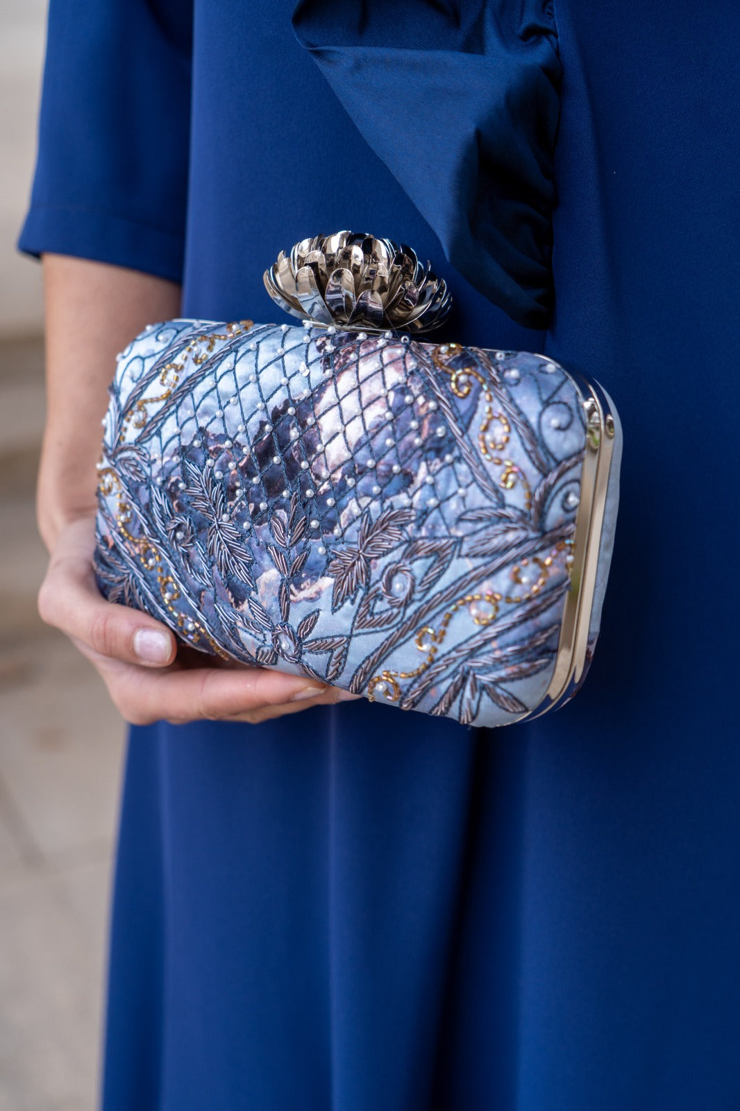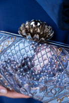 Rigid box with a silver water lily-shaped knob and a long chain for hanging. Decorated with beads in blue, gray, and silver on one side and plain on the other.