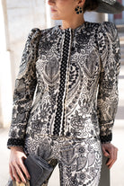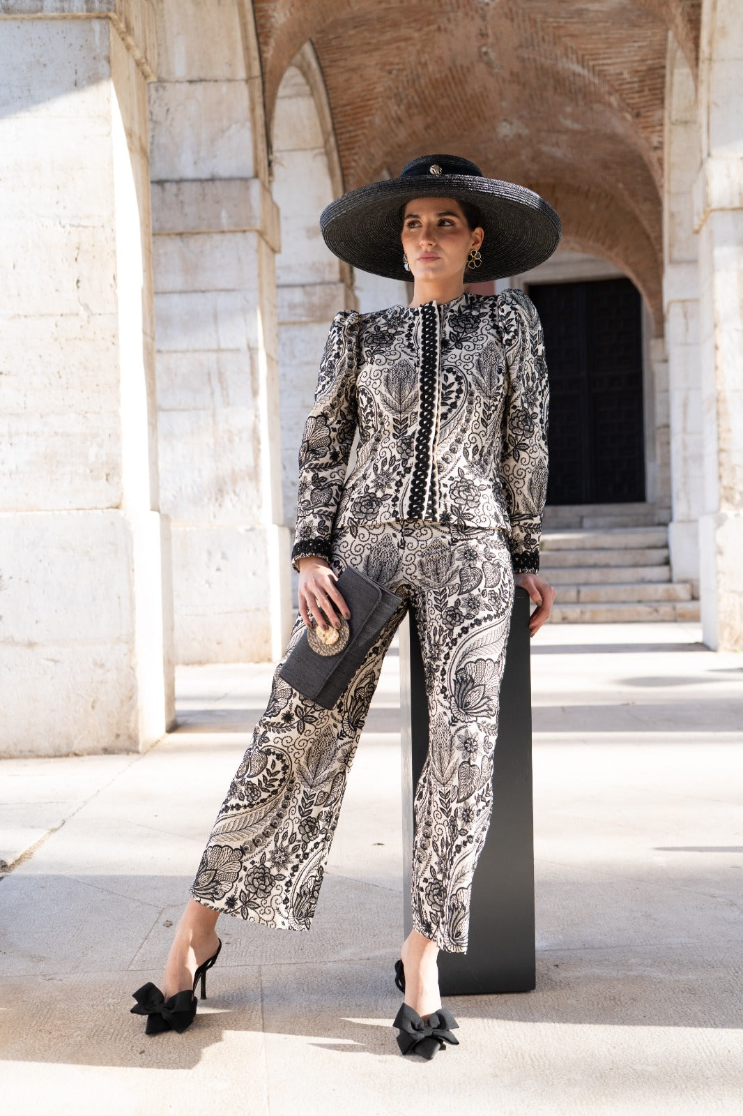 This set includes a jacket made from hand-embroidered fabric with a contrasting floral design, slightly structured shoulders, long sleeves, and a tailored fit. The straight-leg trousers flatter the figure, while the fabric's drape provides both comfort and sophistication. Available in beige and black.