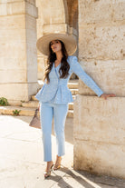 Set consisting of a brocade jacket with long sleeves, double-breasted with buttons and peplum. Trousers with a high waist. In blue.