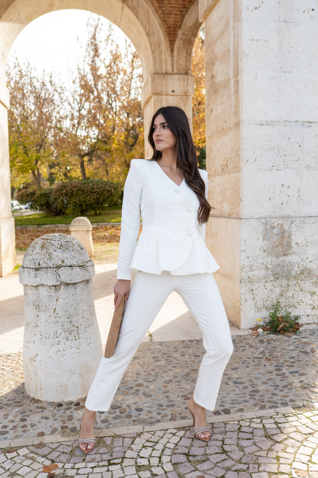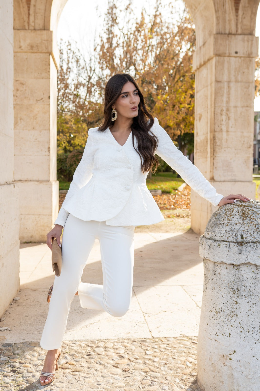 Set consisting of a brocade jacket with long sleeves, double-breasted with buttons and peplum. Trousers with a high waist. In white.